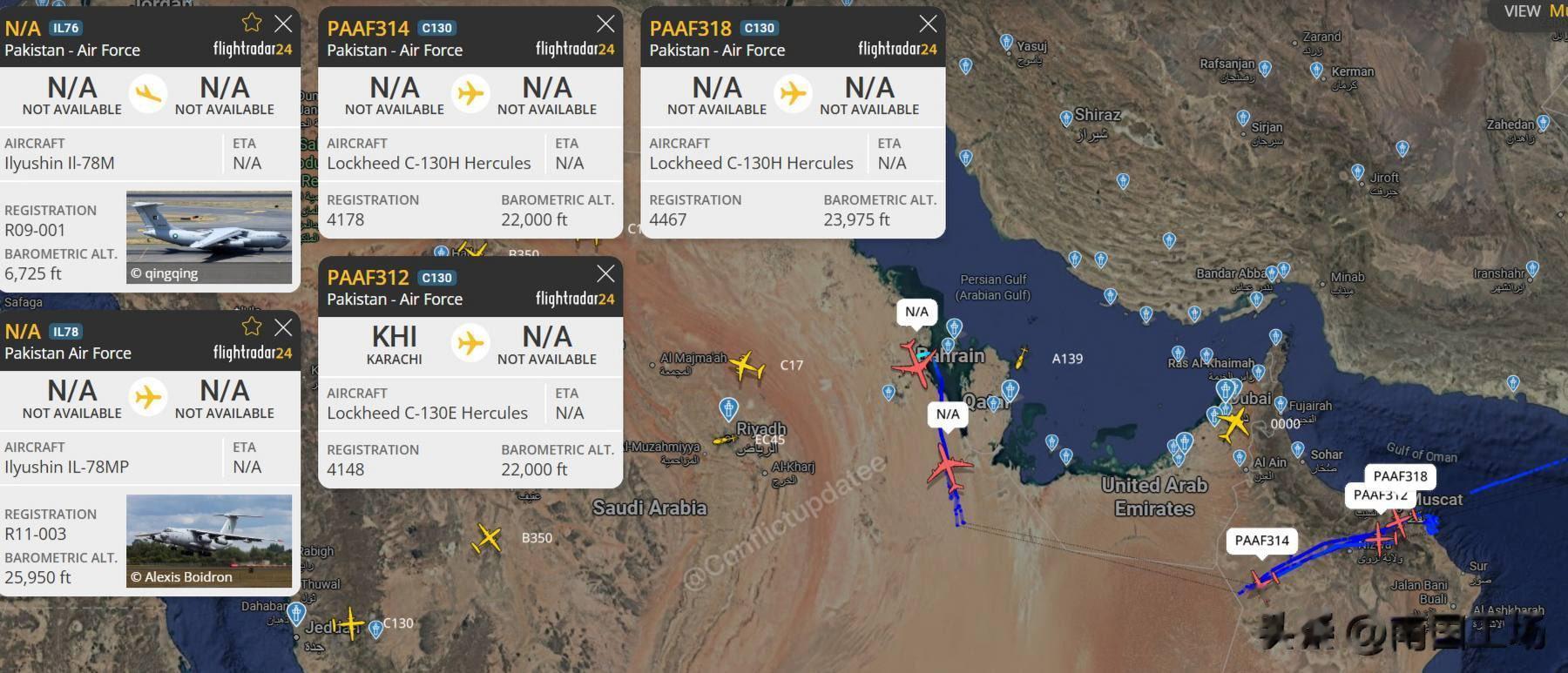 巴基斯坦空军2架加油机,4架运输机,1架预警机,多架战斗机出兵中东