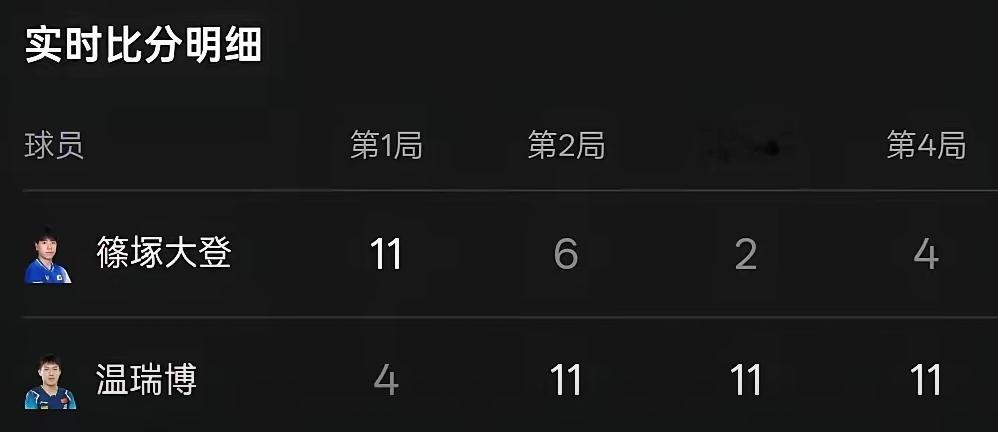 11-6/11-2/11-4,起势后温瑞博无法被阻挡,以碾压之势连赢三局,后三局球加起来,只让篠塚大登拿到了12分。