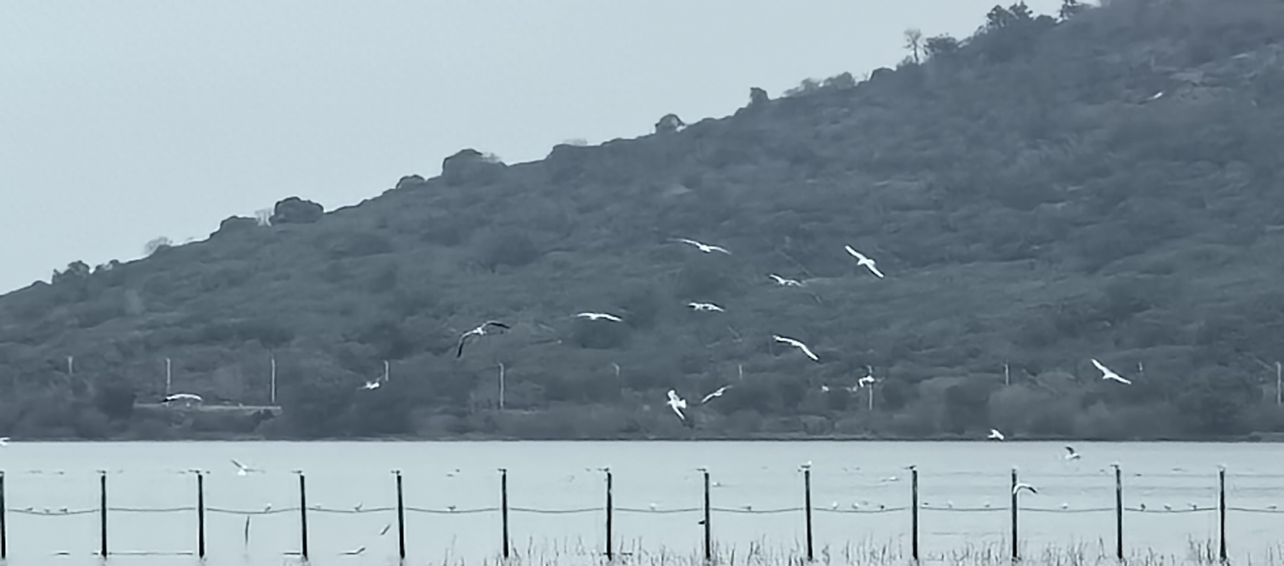 刚接近太湖,就见一只只海鸥,停靠在一排河面的木桩上,以及与木桩相连的绳索上。像木桩上戴一个小小的帽子,当海鸥飞起的时候,白色的翅膀划过天空,叽叽喳喳的 叫声清脆悦耳。