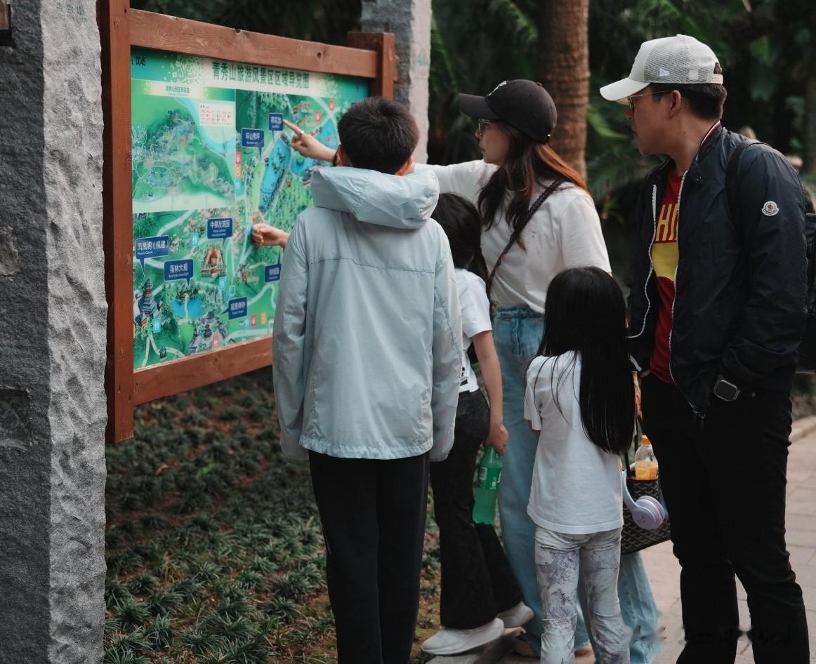 从霍启刚分享的照片来看,他们一家五口在当地去爬了青秀山,一家人在登山前仔细查看导览图,确定路线。爬山对他们一家来说,是去到哪里都必不可少的一项运动。在香港,也经常一家人去爬山。