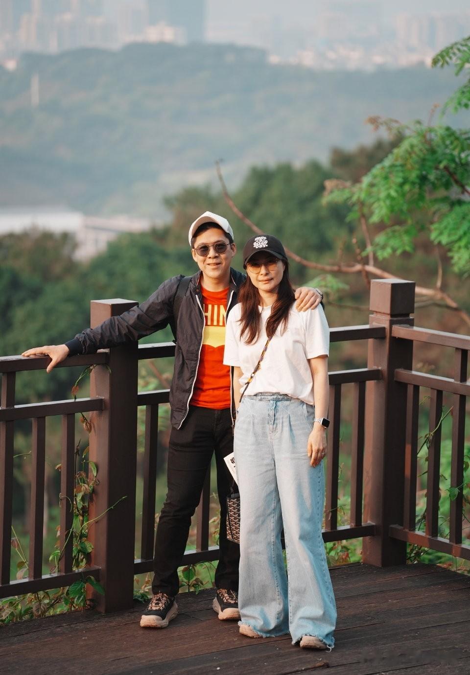 他们二人站在木质观景栏杆旁,背景是郁郁葱葱的山林与远处朦胧的城市轮廓,画面氛围温馨惬意,展现出他们生活中自然真实、恩爱和美的一面。