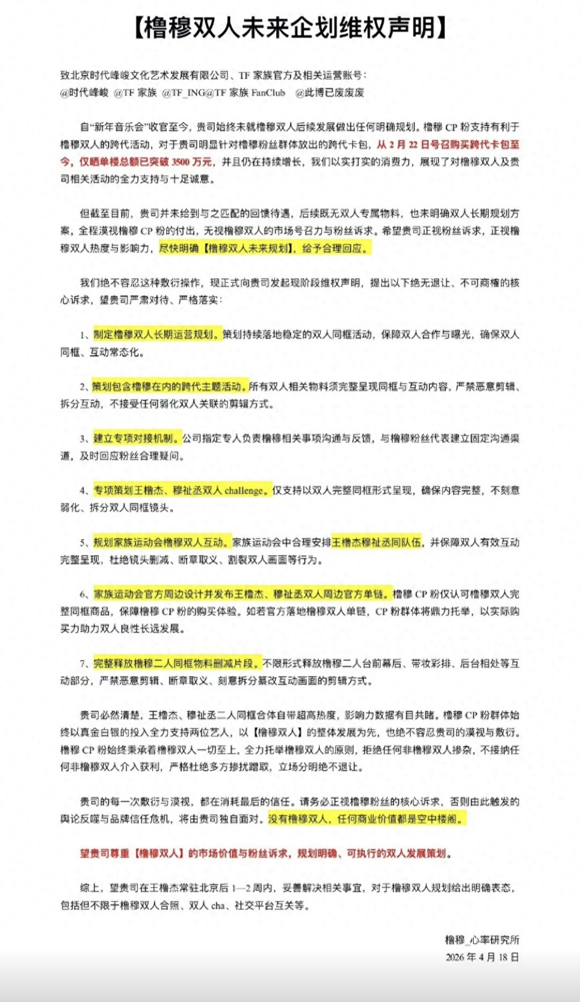 这次维权声明也整得特别接地气,没有那种冷冰冰的官话套话,全是粉丝们掏心窝子的话:别消耗CP热度、别乱带节奏、别让真心磕糖的人寒心,核心就一个——好好守护我们喜欢的两个人,让他们安安稳稳走下去。