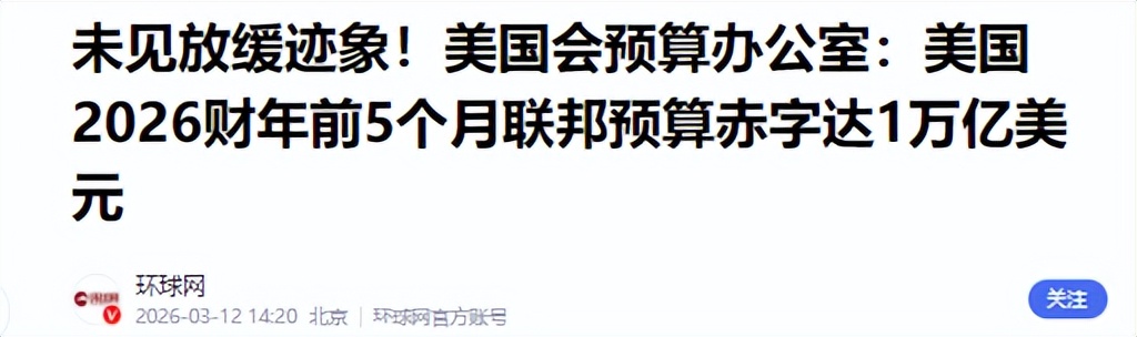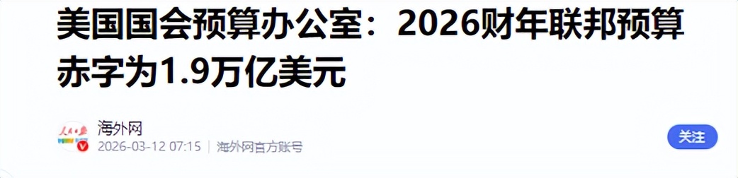 第一个困境就是赤字疯涨,2026财年美国的预算赤字就要达到1.9万亿美元。