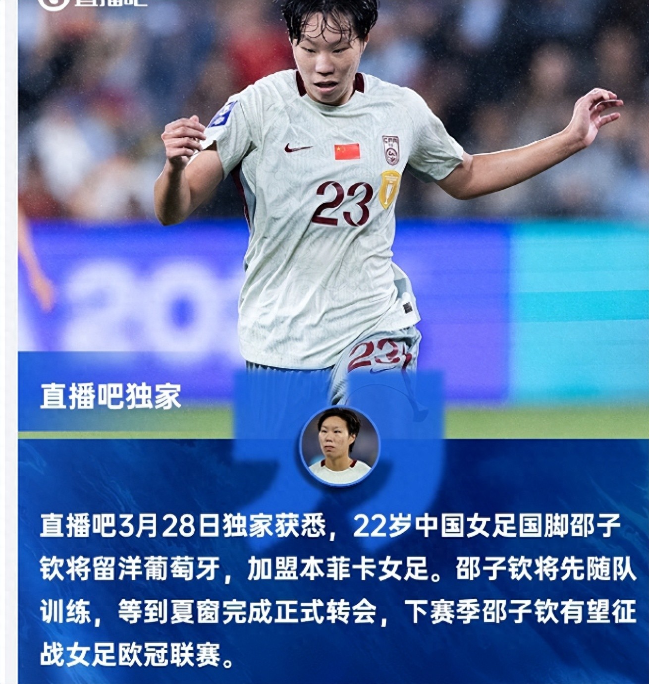 当中国男足还在为世界杯预选赛挣扎时,一位22岁的女足姑娘已经用实力敲开欧冠豪门的大门!中国女足前锋邵子钦将启程飞赴葡萄牙里斯本,正式加盟本菲卡女足,这支上赛季葡超亚军、下赛季欧冠参赛队,即将迎来首位中国面孔!她的加入,能否让中国足球从此崛起?