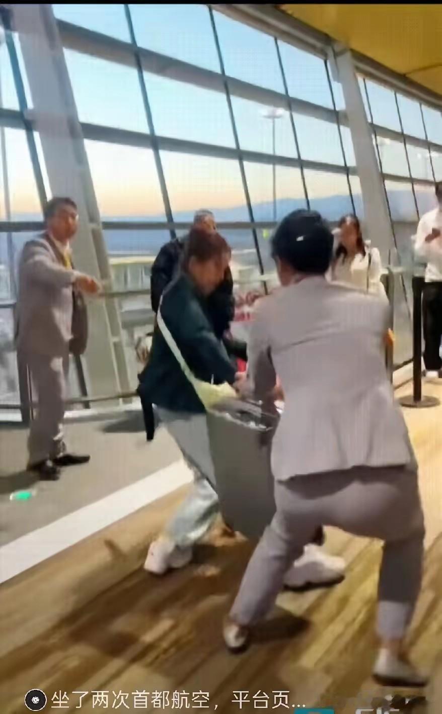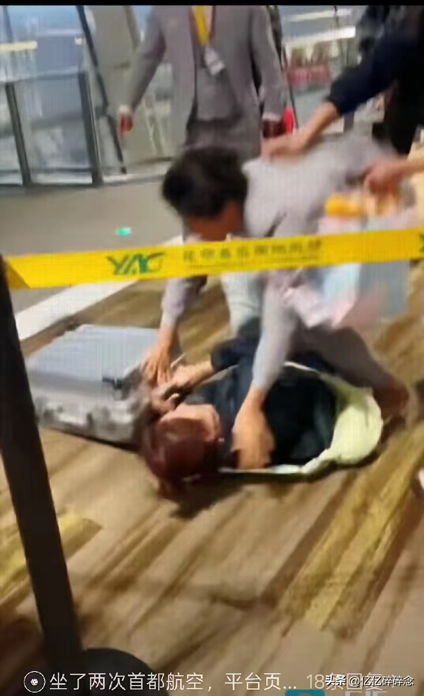 觉得航司是在故意坑人,拎着箱子就要硬闯。拉扯之间,跟阻拦的地勤一起摔倒在地,紧接着就是前面那一幕全武行。