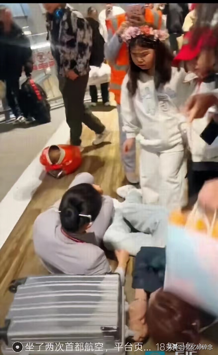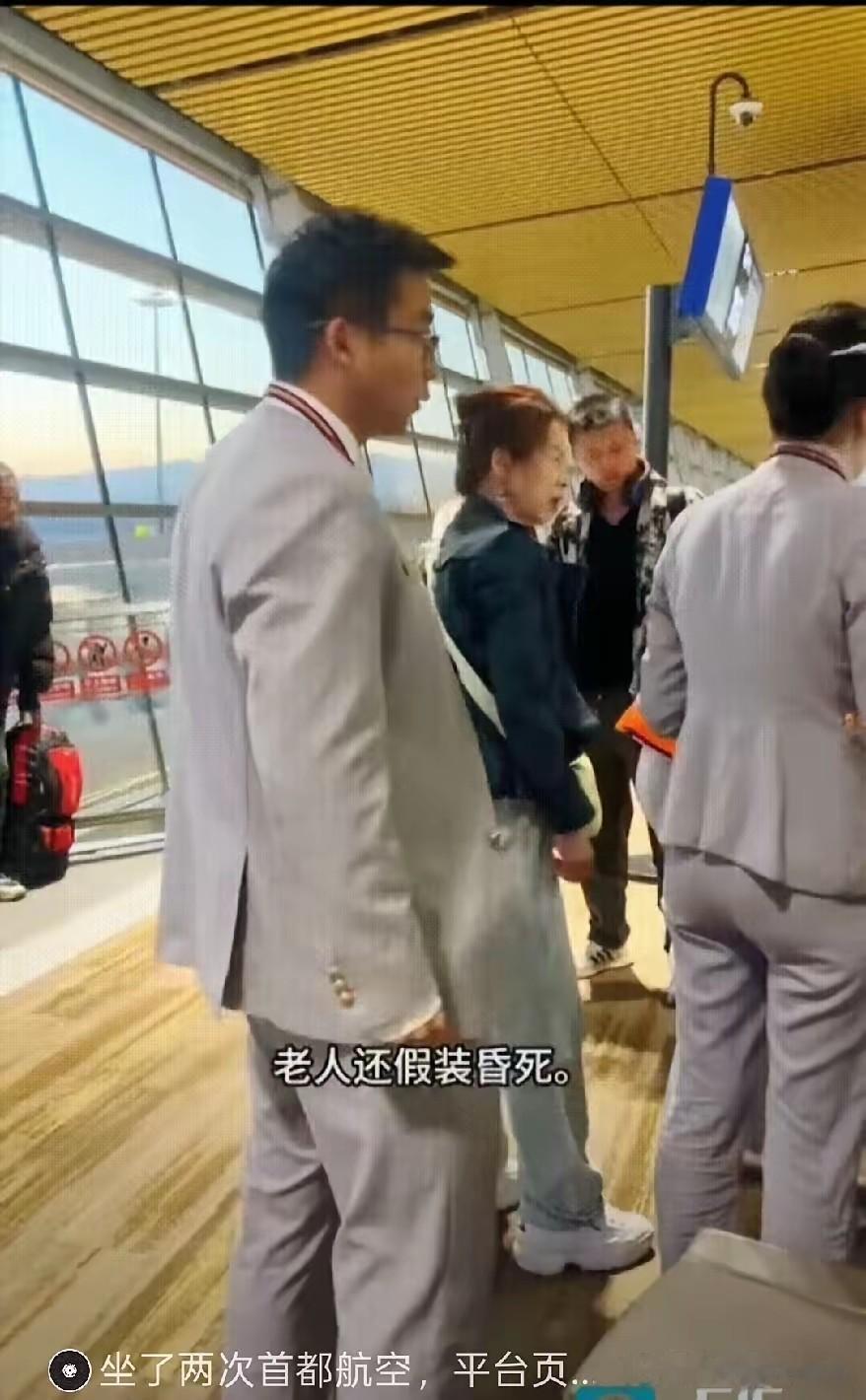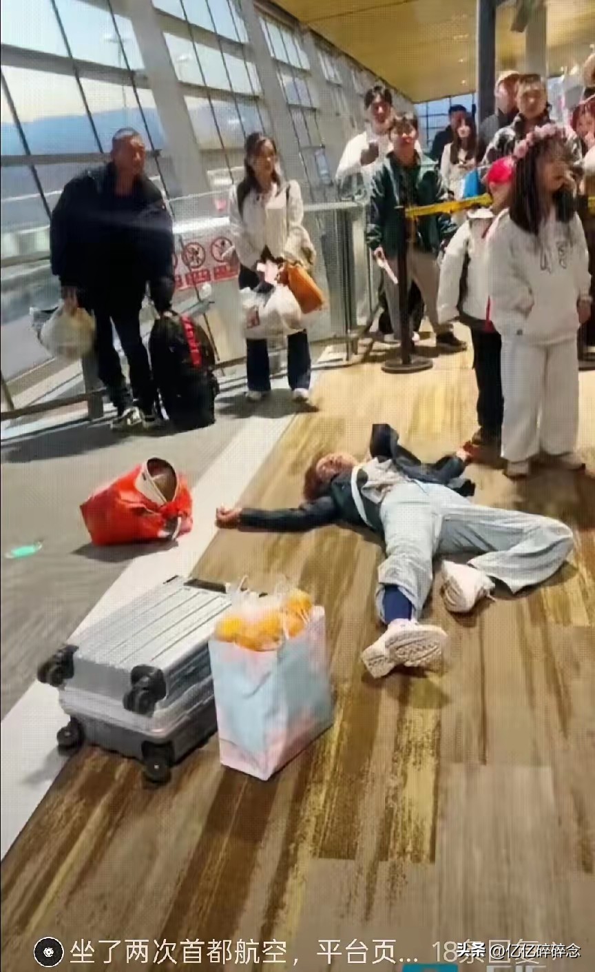 姥姥躺在地上撒泼打滚。女儿非但没拉着点,反而冲上去对着倒地的女地勤就是一顿连踹带打。男工作人员想过去制止,老太太在地上顺势就是一脚蹬开。