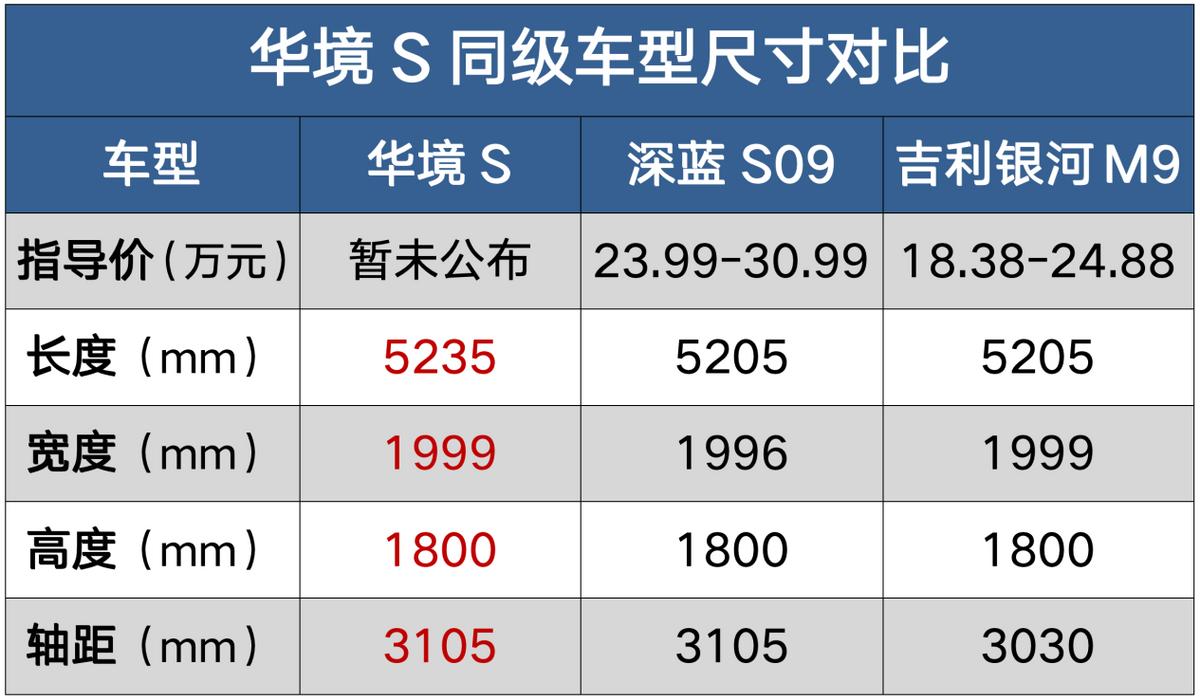 我把华境S跟深蓝S09、吉利银河M9的尺寸做了个对比,它们仨的个头儿,几乎是差不多大的,或者我这么讲吧:它跟问界M9、理想L9这些“九字辈”的车差不多大,这样讲的话,你对它的尺寸,有一个直观的感受了吧?