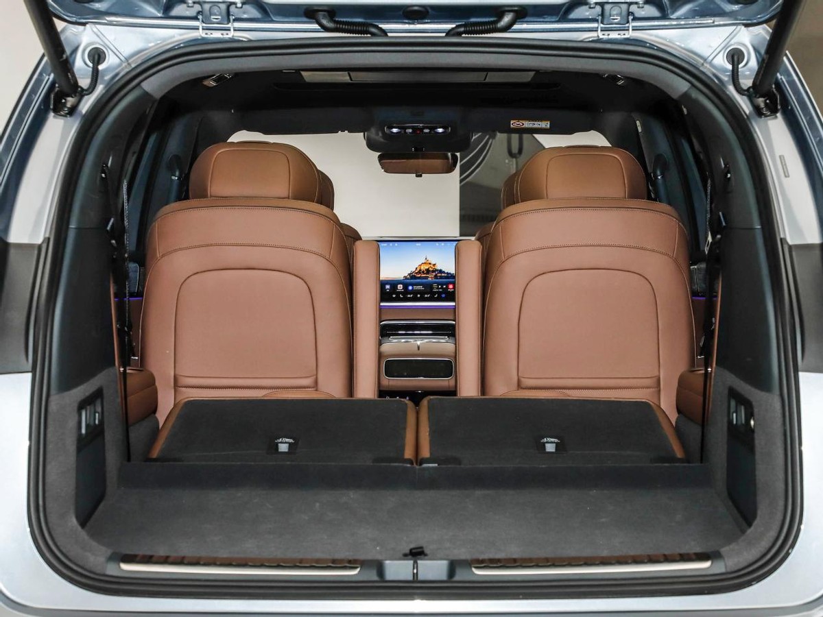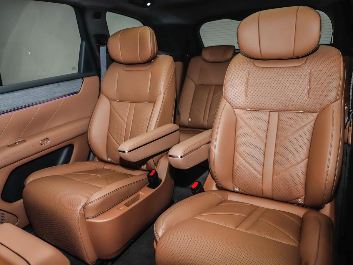 华境S车内用的是2+2+2的六座椅布局,第二排座椅配备了腿托,加热、通风、按摩也都没有缺席,除此之外,后排小桌板、吊顶屏、车载冰箱等等也都给安排上了;第三排座椅也是电动调节的,并且可以按比例放倒。