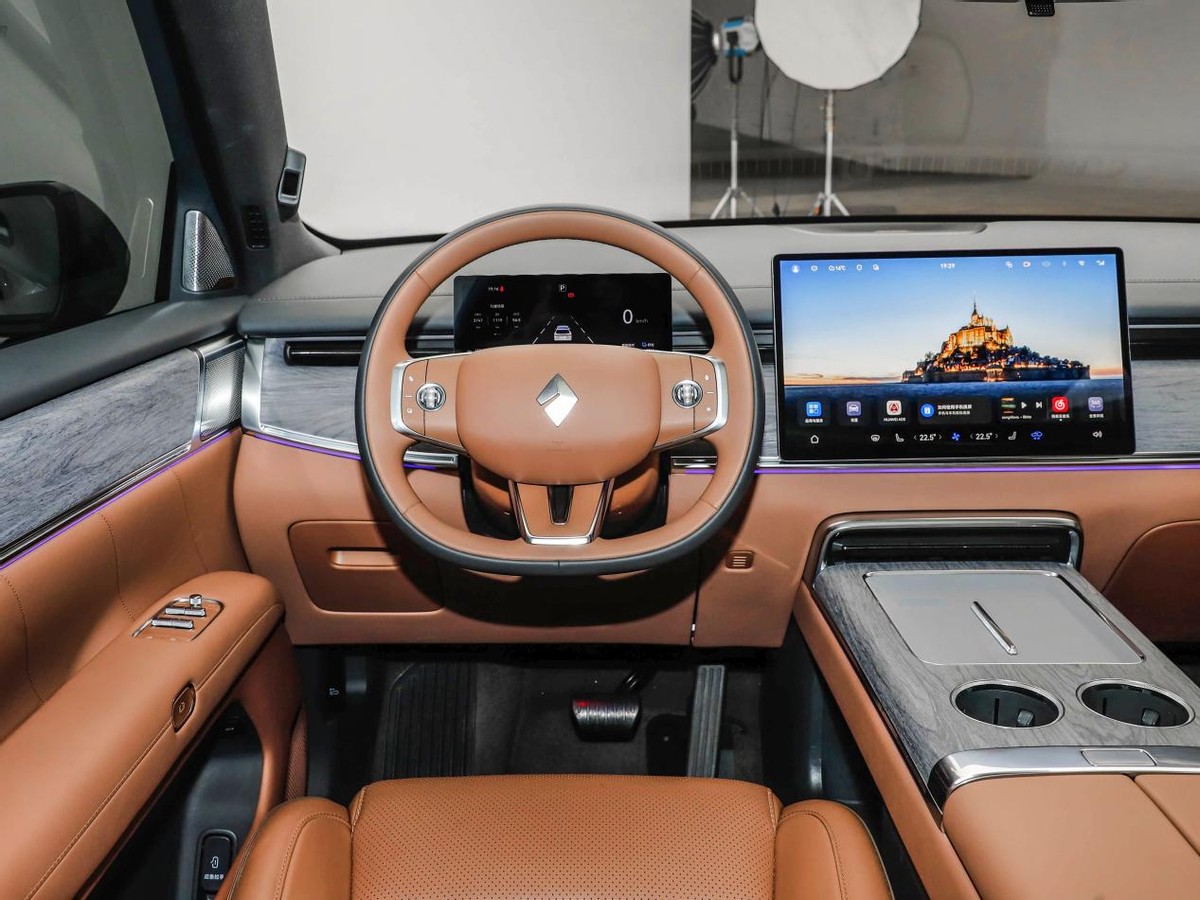 车内不出意外地采用了我们熟悉的简约风格,如今的新能源车都流行这种设计,什么悬浮式中控屏、双拼色方向盘、木纹饰板、前排座椅加热/通风/按摩等等,这些我们已经见怪不怪了,车机用的华为HarmonyOS系统,其实这些智能化配置跟华为合作,有一个好处就是:屏幕不会卡顿,用户体验好,而且车企也省事儿,算是一举三得吧。