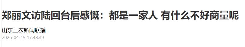 台媒“中时新闻网”4月17日报道,郑丽文在一档网络节目谈及对“大陆武统”的看法,她说我们都是一家人,不能连祖先都不认, 有什么深仇大恨和隔阂非这样不可呢,大陆的发展已成为台湾人的底气,不会变成台湾人的威胁,而是成为台湾人的机遇。