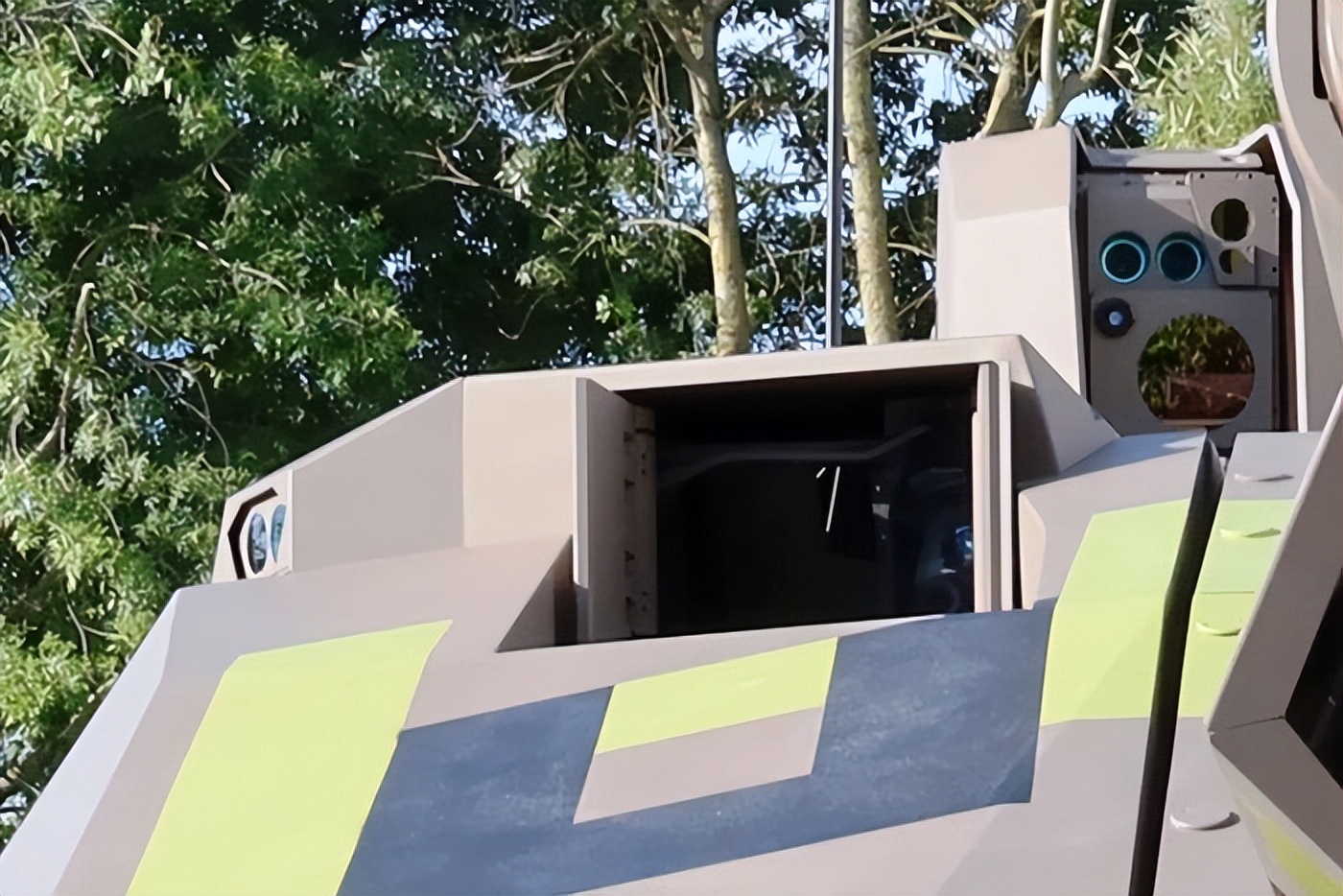 车内设计更是科技感拉满,乘员座椅上配备了一块23英寸主屏幕,直接连接车身前方的360°摄像头,堪称“虚拟挡风玻璃”——既能查看指挥官、炮手瞄准镜等其他传感器的画面,还支持画中画功能,甚至能调用战斗管理系统,规划、监控整个作战行动。主屏幕下方有两个10英寸备用屏,可显示三种不同视角,就算主屏幕出现故障,也能无缝衔接,不影响操作;另外还有两个水平屏,和主屏齐高,能实时呈现炮塔左右360°的画面,既能让乘员看清周围环境,又能守住装甲防护,真正做到一举两得。