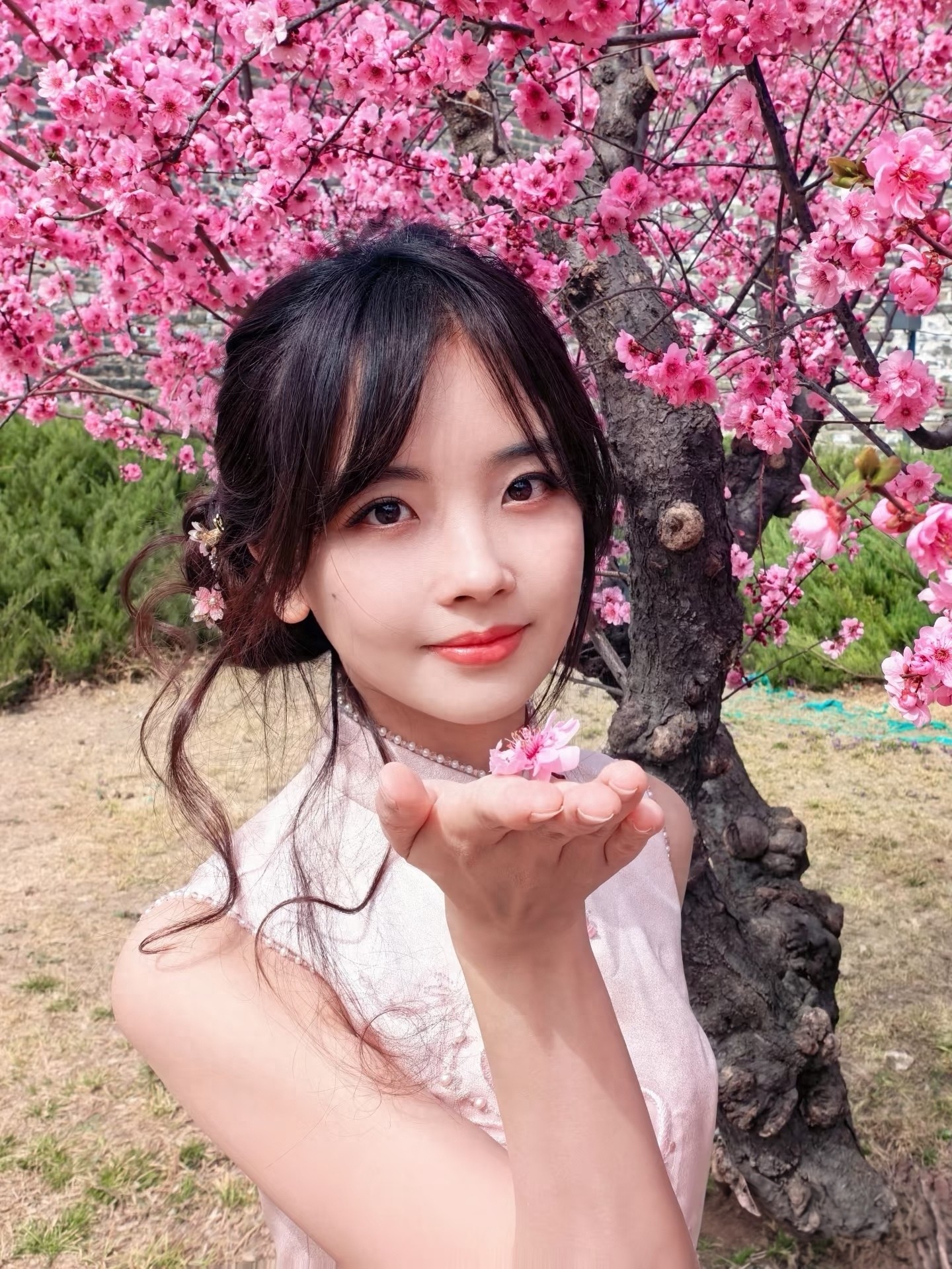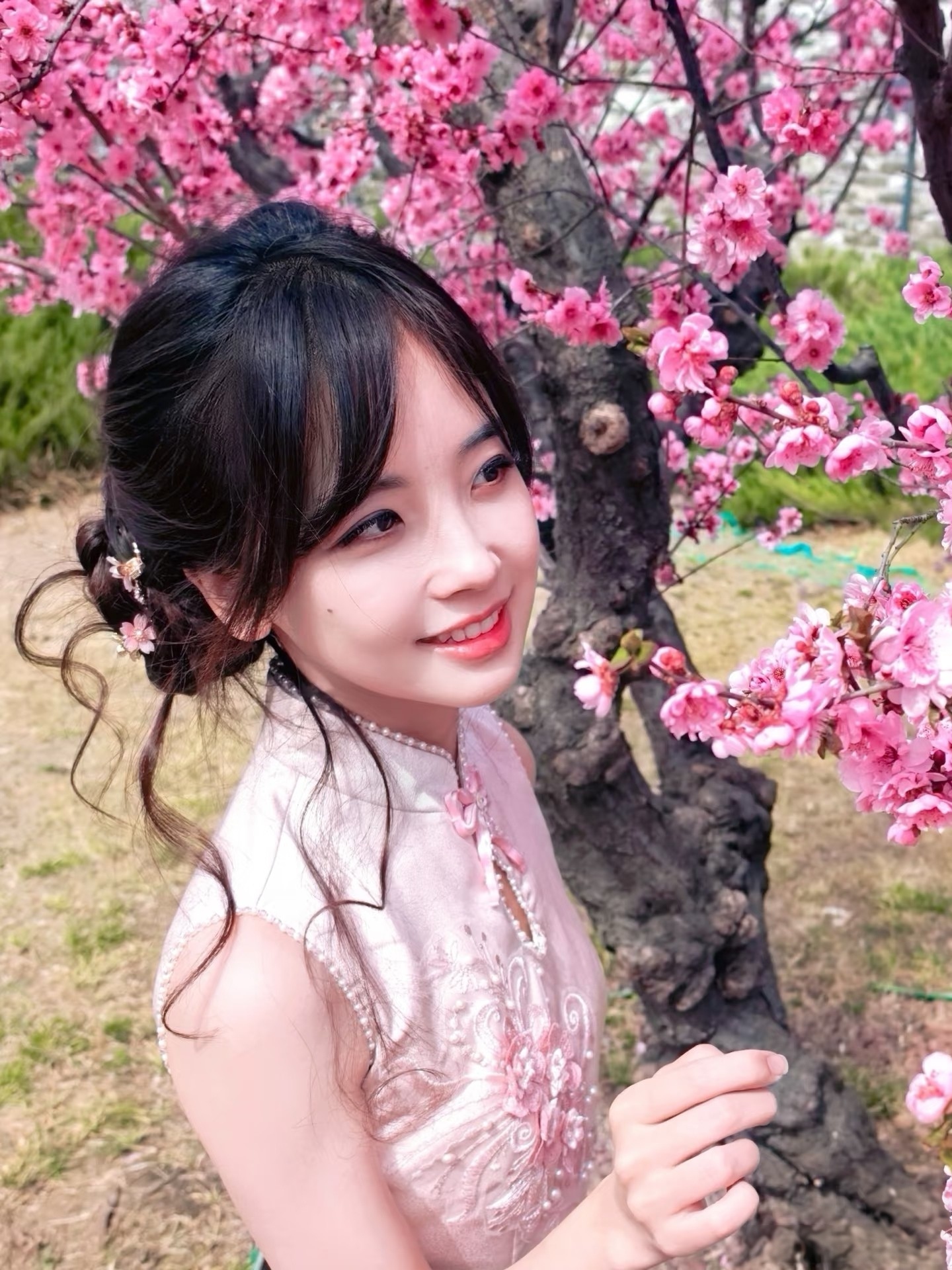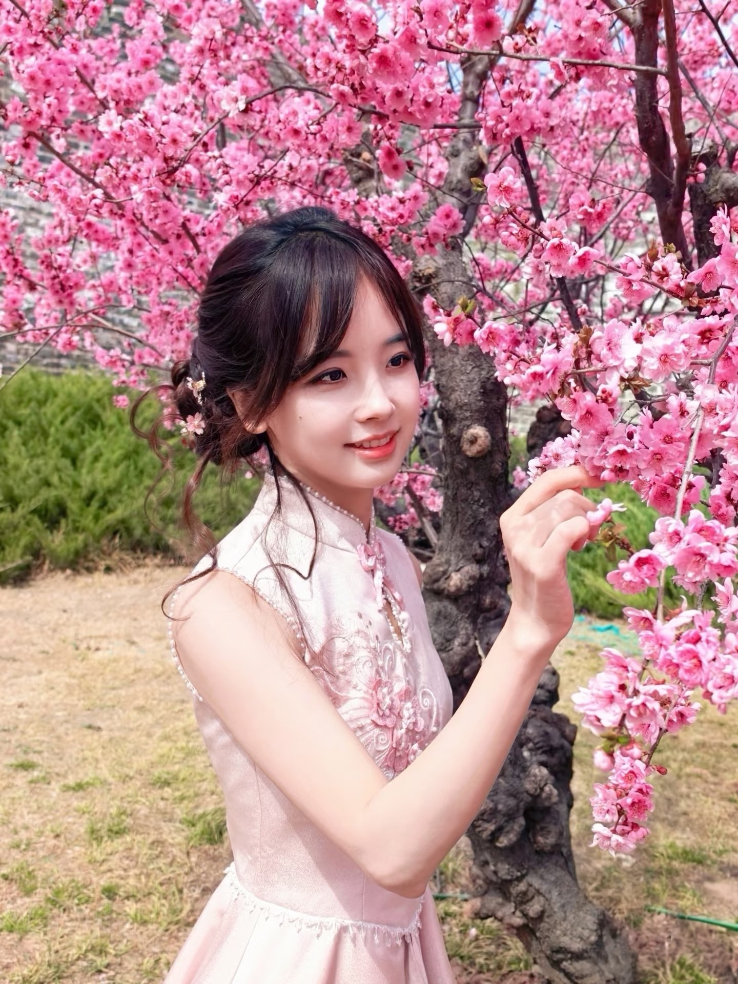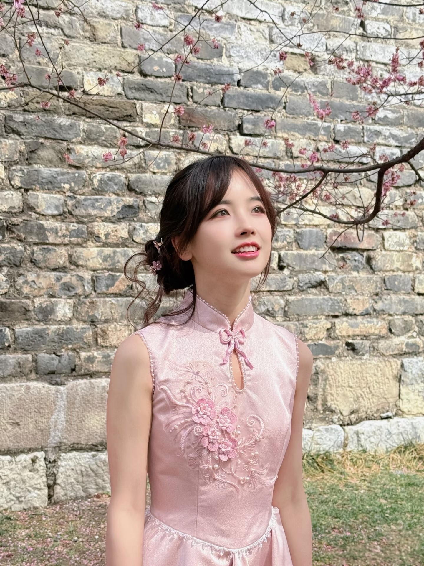王冰冰穿粉色新中式裙子赏花,人比花更娇艳!
