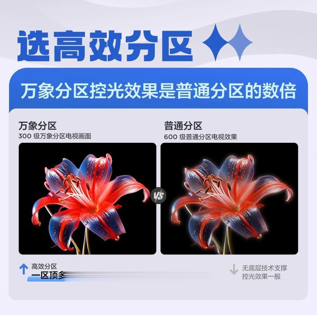 如果说色域是画面的灵魂,那么对比度就是支撑灵魂的骨架。在电视厂商争相提升对比度的道路上,分区控光技术曾陷入“数量至上”的误区。TCL的万象分区技术则跳出了这一框架,区别于普通分区,通过一系列底层技术的全面升级,做到了每个发光单位的效率都大幅提升,实现“一区顶多区”的效果,画面更加深邃立体,通透性和细节呈现表现都更佳。