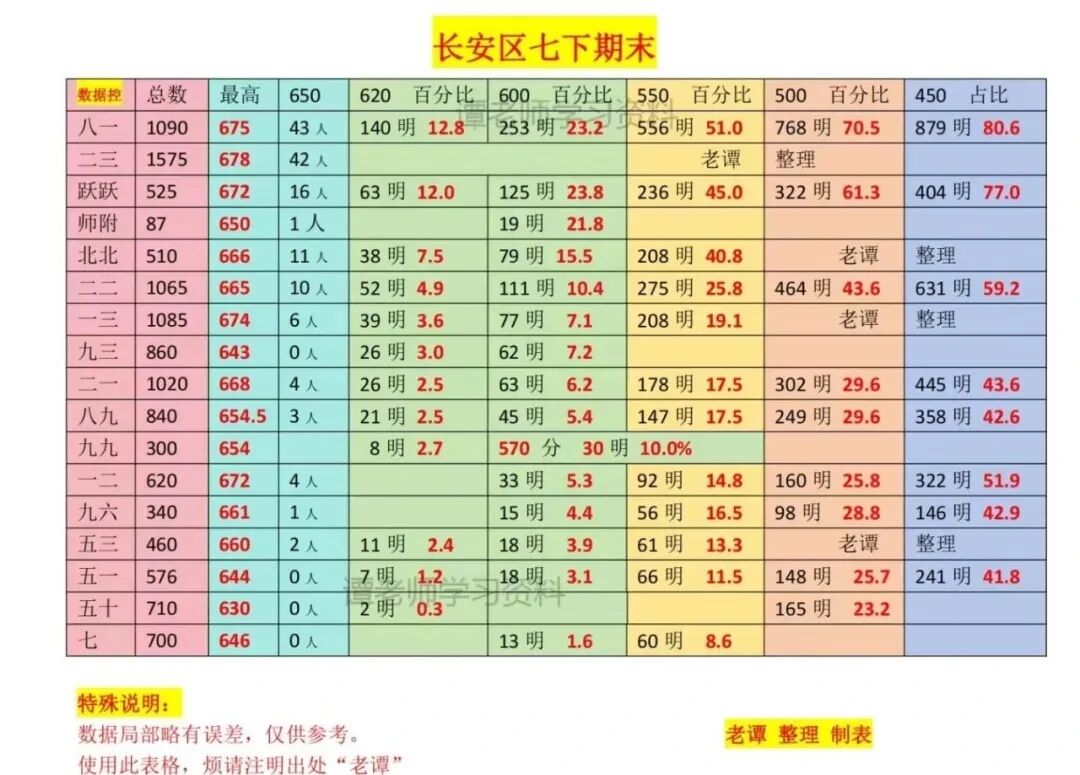 二、成绩不会说谎:一线初中名校依然“霸榜”光说不算,数据为证。根据@老谭整理的2025年长安区初一下学期的统考数据,81中本部和跃进校区在高分段的占比中依旧表现突出,23中也不甘落后,但普通初中与他们还有不少差距。目前来看,长安区依然是81中本部、81跃进和23中;新华区还是42中和28中两强争霸;43中和40中依旧领跑裕华。更关键的是,阳光招生和均衡分班也让头部初中班里的生源两极分化加剧——班级第一和第十名能差出二三十分。但即便如此,头部初中的整体高分占比、师资管理优势,依然让普通初中难以望其项背。
