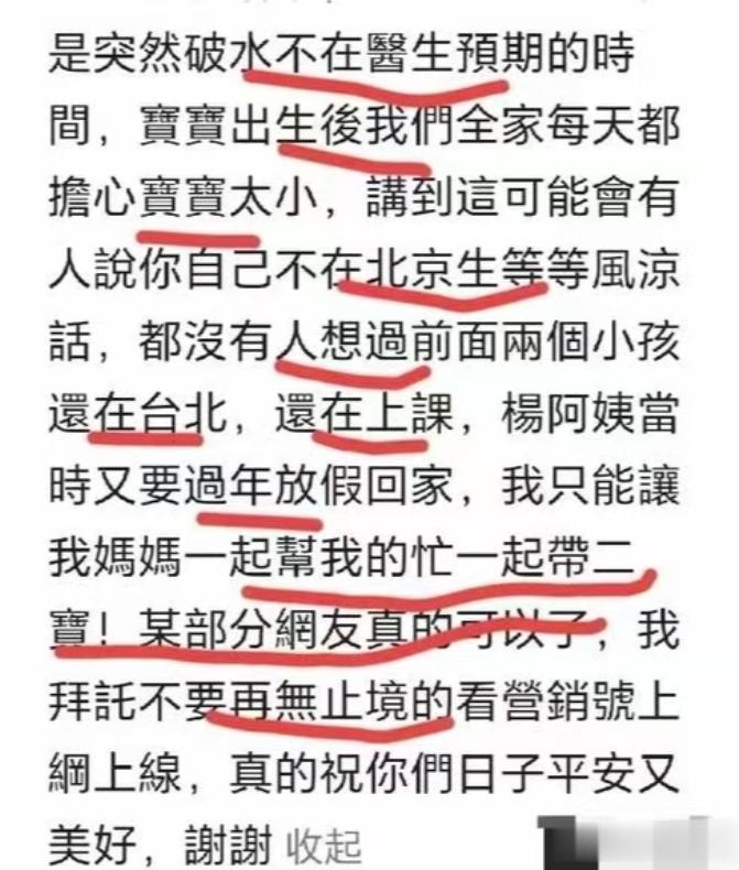 她给出的解释是孩子出生时让她猝不及防,羊水突然就破了,不在医生的预料之内,孩子如今太小了,担心回北京对孩子不好。