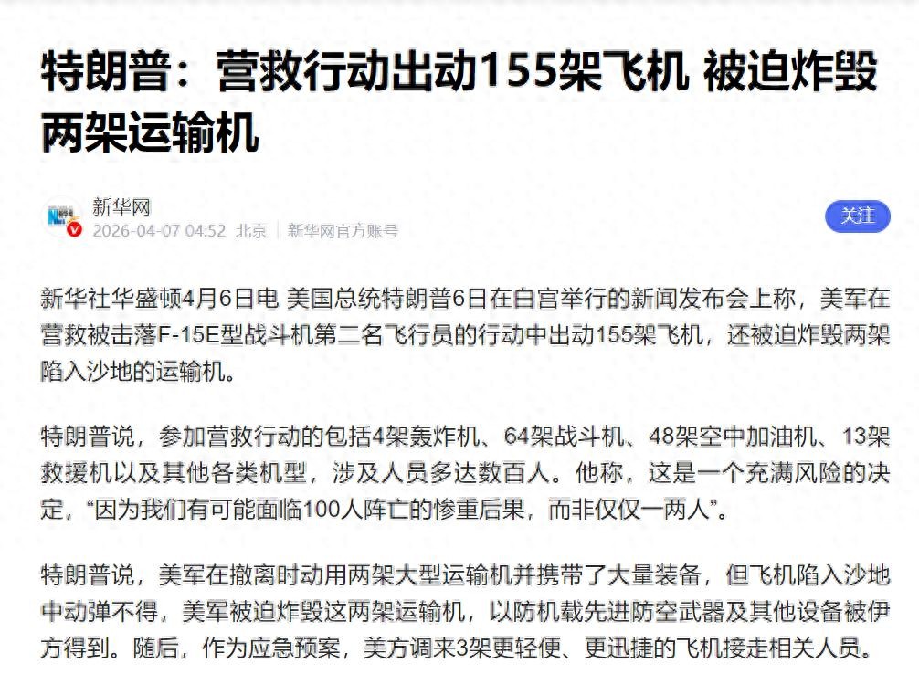 随着第二名跳伞降落在伊朗境内的F-15E战斗机飞行员被美军发动特种作战行动营救出来,因为这架F-15E战斗机被击落引发的美军一系列作战行动暂告一段落,美国方面已经承认这架F-15E战斗机确实是被伊朗防空导弹击落的,同时特朗普还在公开场合透露:为了营救第二名美军飞行员,美军在行动过程中出动了高达155架军机,包括64架战斗机、48架加油机、13架救援机以及4架轰炸机和大量直升机、无人机在内的机型。同时相关信息显示,美军为了营救这两名飞行员,损失了多架直升机和C-130运输机等军机,这次营救行动美军付出的代价是非常大的。