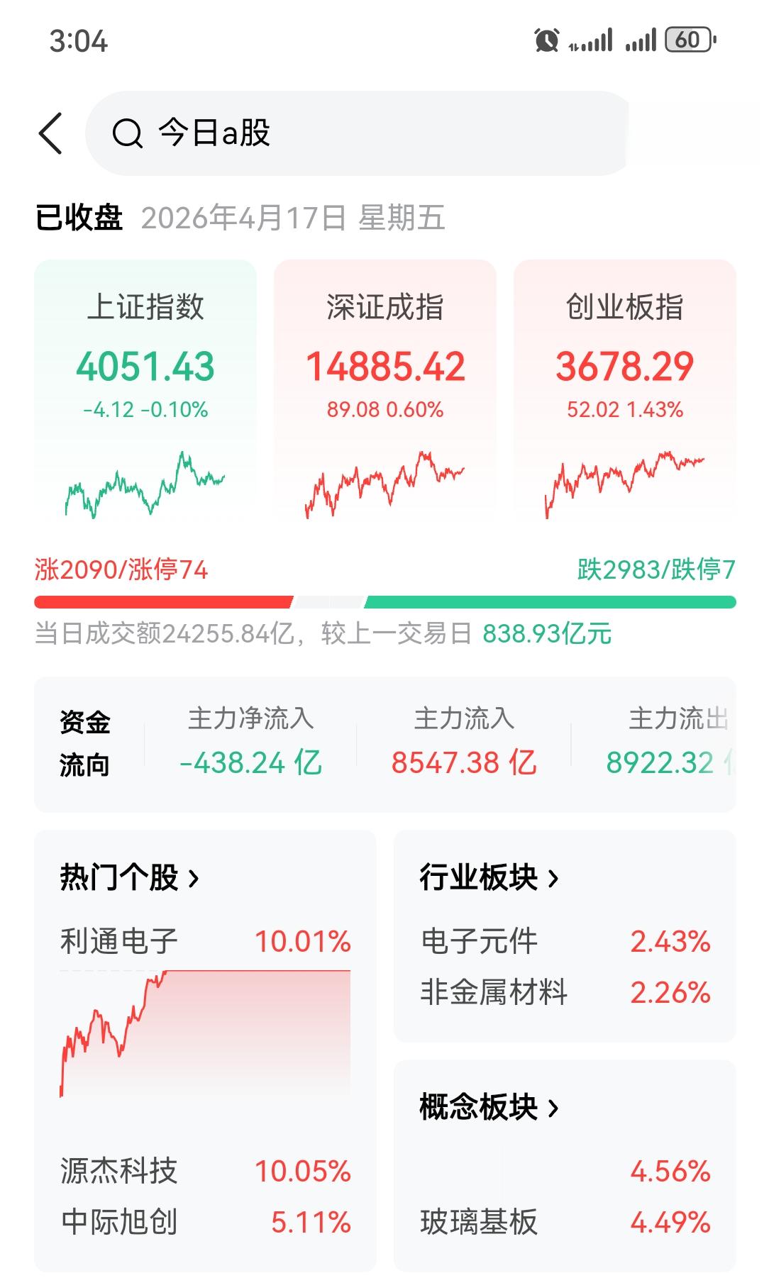 2026年4月17日,周五。A股三大指数涨跌不一,上证指数收报4051.43点,微跌0.10%;深证成指报14885.42点,上涨0.60%,续创逾4年新高;创业板指报3678.29点,上涨1.43%,再创近11年新高;北证50指数大涨4.77%。全市场成交额24529亿元,较上一交易日放量979亿元。全市场超2300只个股上涨,近3000只个股下跌。