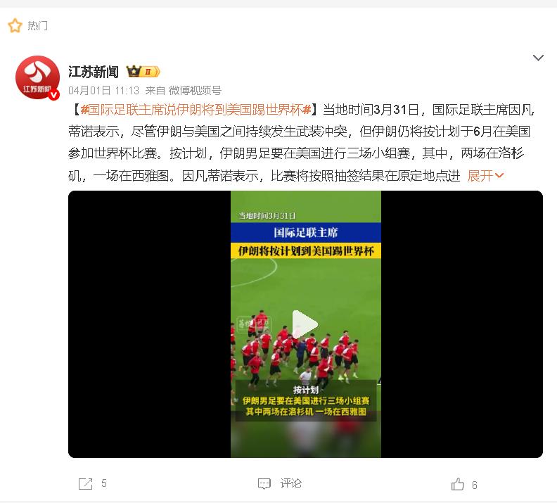 最近国际足联主席因凡蒂诺一锤定音,尽管美伊冲突不断,伊朗仍将按计划于6月在洛杉矶和西雅图参加世界杯小组赛。这一决定瞬间引爆舆论,当足球与地缘政治碰撞,绿茵场是否会成为新的“战场”?这场争议背后,藏着比胜负更值得深思的博弈,他们能否搭起和平的希望?
