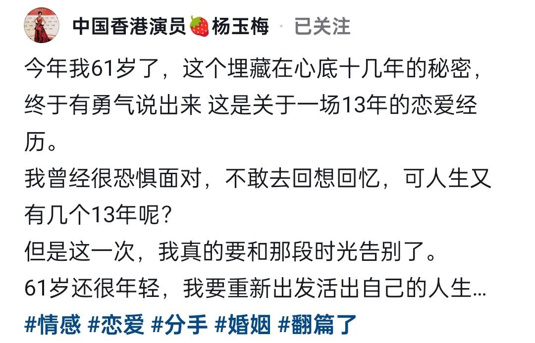 最后,杨玉梅还是与他分手了,那时她已经50岁了,这段感情对杨玉梅伤害很大,她付出许多,不论是青春还是精力,甚至是自己的事业,但对方根本没有想过和她结婚。