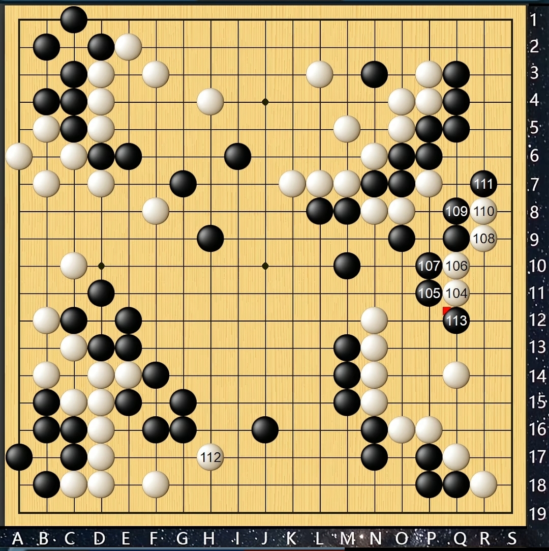 黑71大飞、犹如一道闪电刺破苍穹,令人胆寒。接着黑79拆边、极限扩张,白棋被迫无奈之下只得打入、寻求一线生机。此后,双方在左边展开拳拳到肉的搏杀,黑棋胜势依然不可撼动。