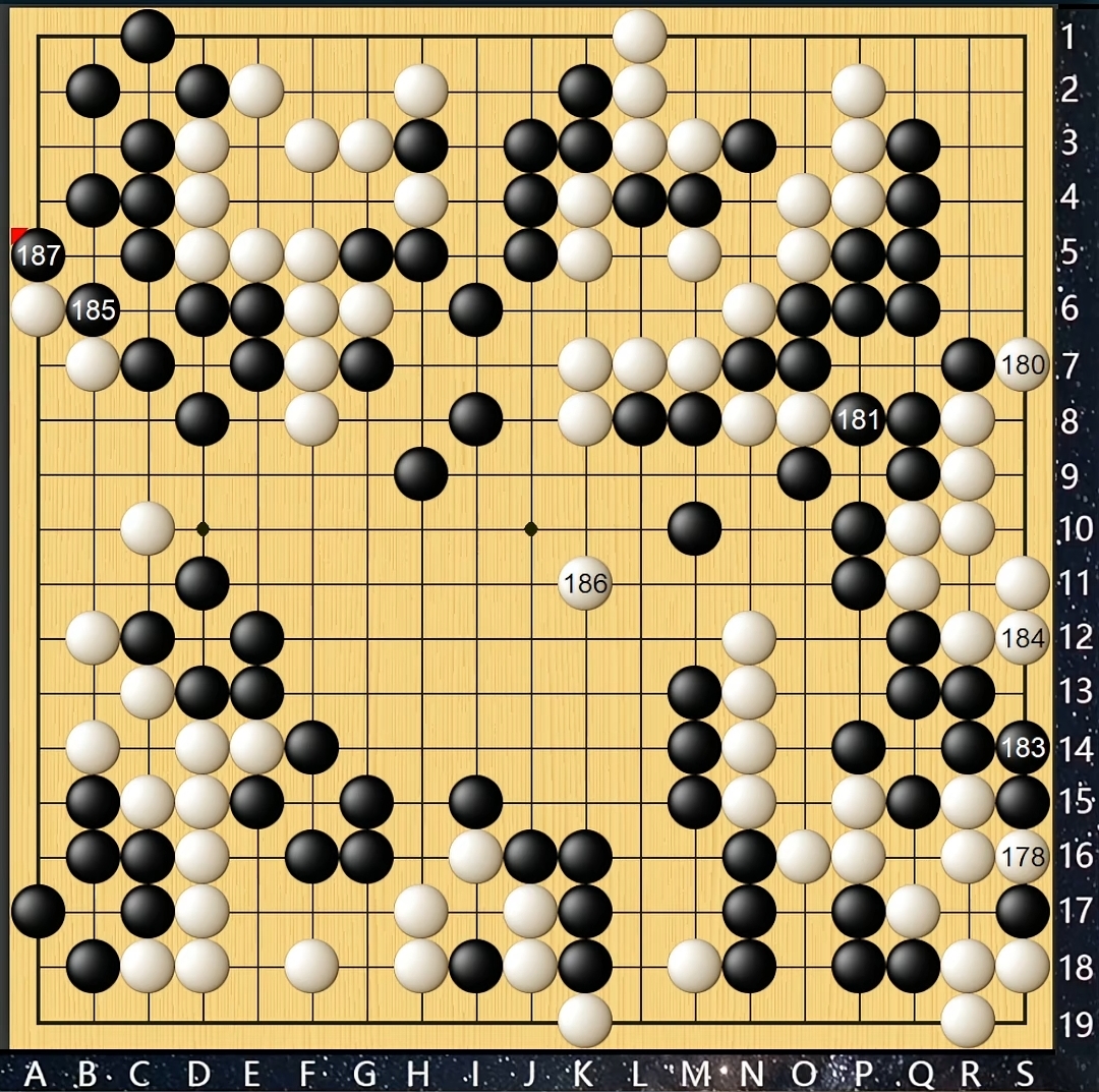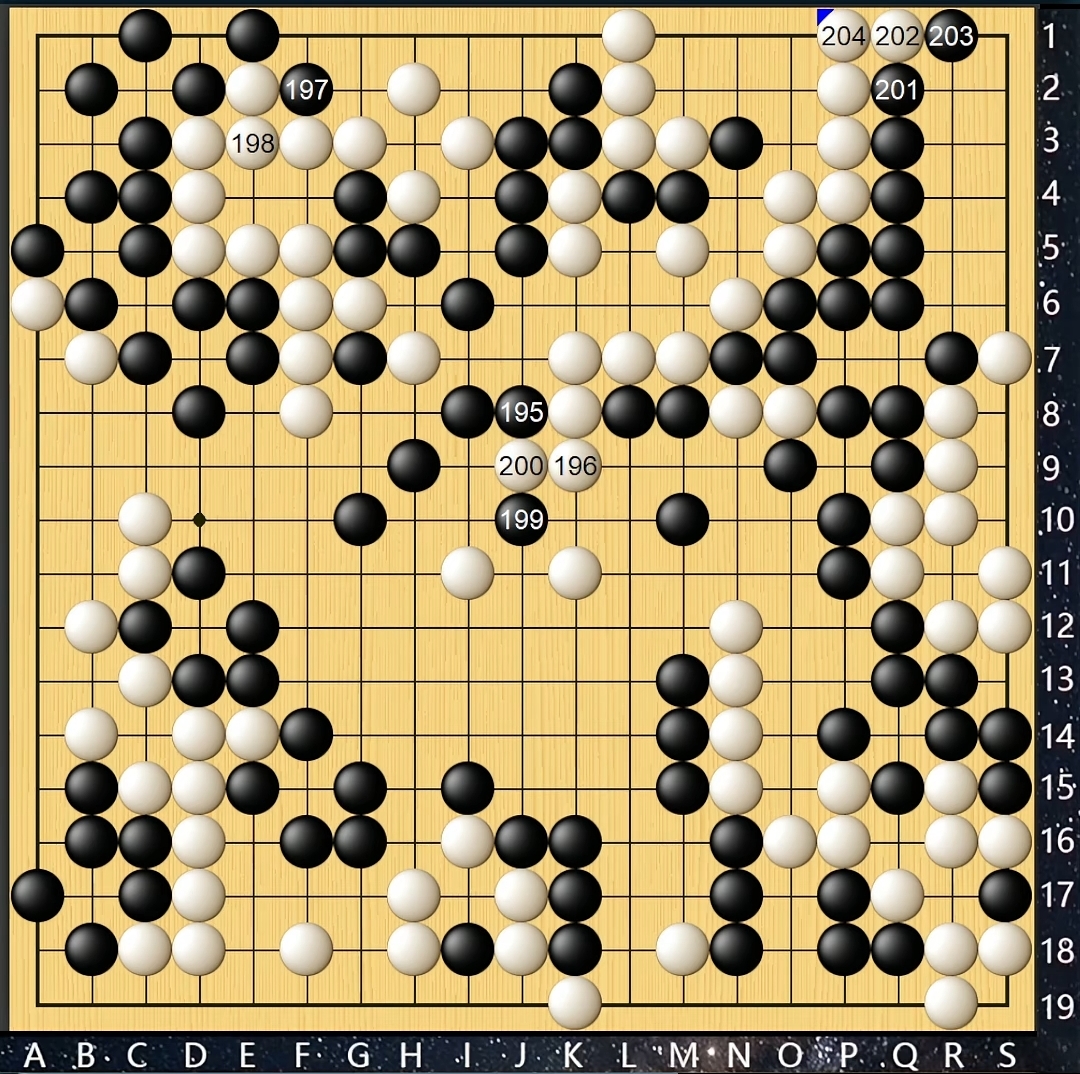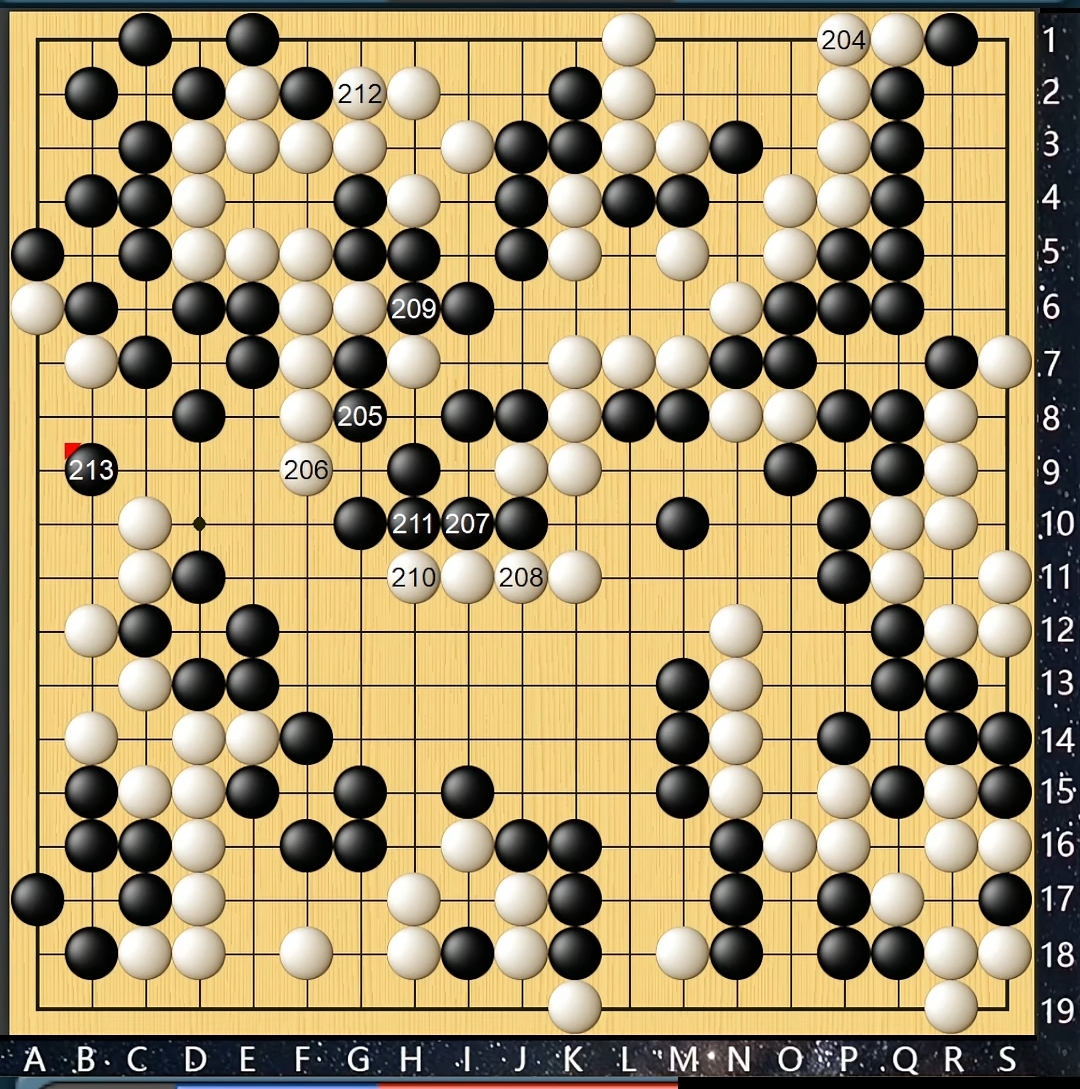 优势下金七段也患得患失、步步退让,此后双方进入一劫定胜负阶段。随着黑187消劫,眼见即将尘埃落定。黑201挡收官、AI认定这是恶手,然而白棋也没能抓住机会跟着应一手,胜机随即溜走。