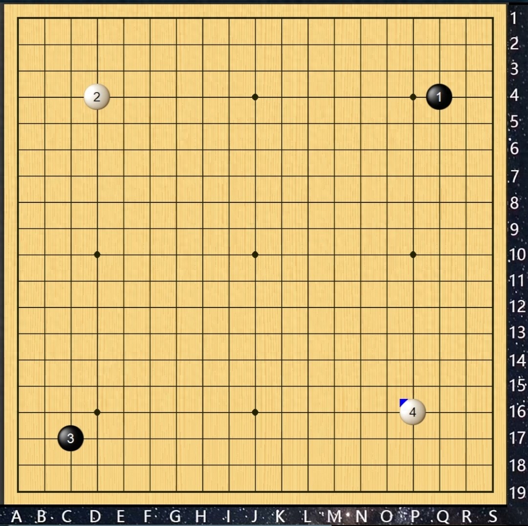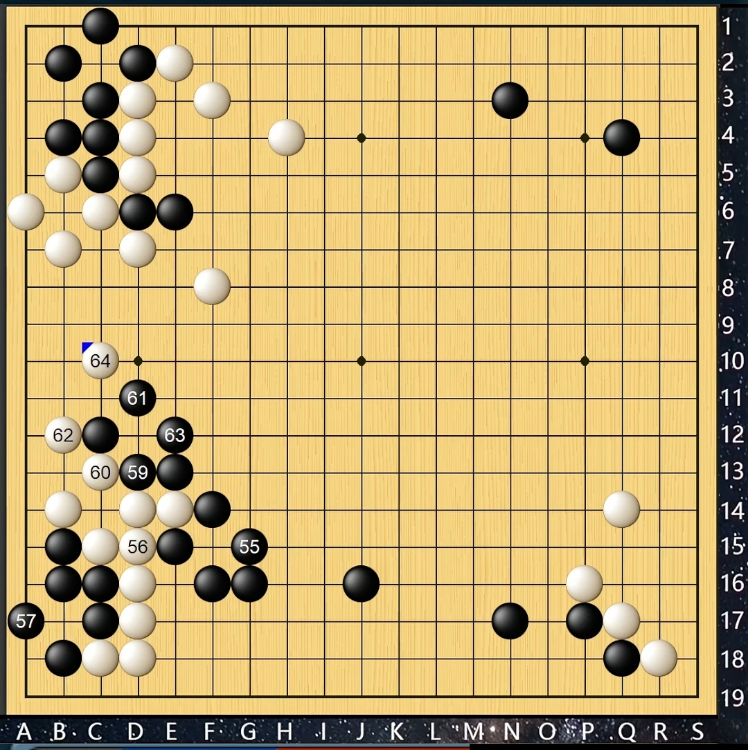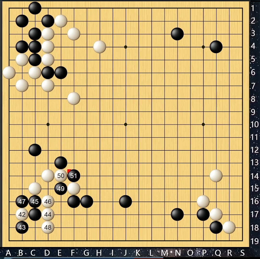 黑以对角小目三三起手,白以对角二连星应对。之后双方在左上角完成定式,焦点随即转移到右下角,黑棋点到为止、快速抢占下方要点。白36飞攻、似有鲸吞黑二子意味,但AI却认为此招欠妥,黑棋胜率随之与白棋持平。