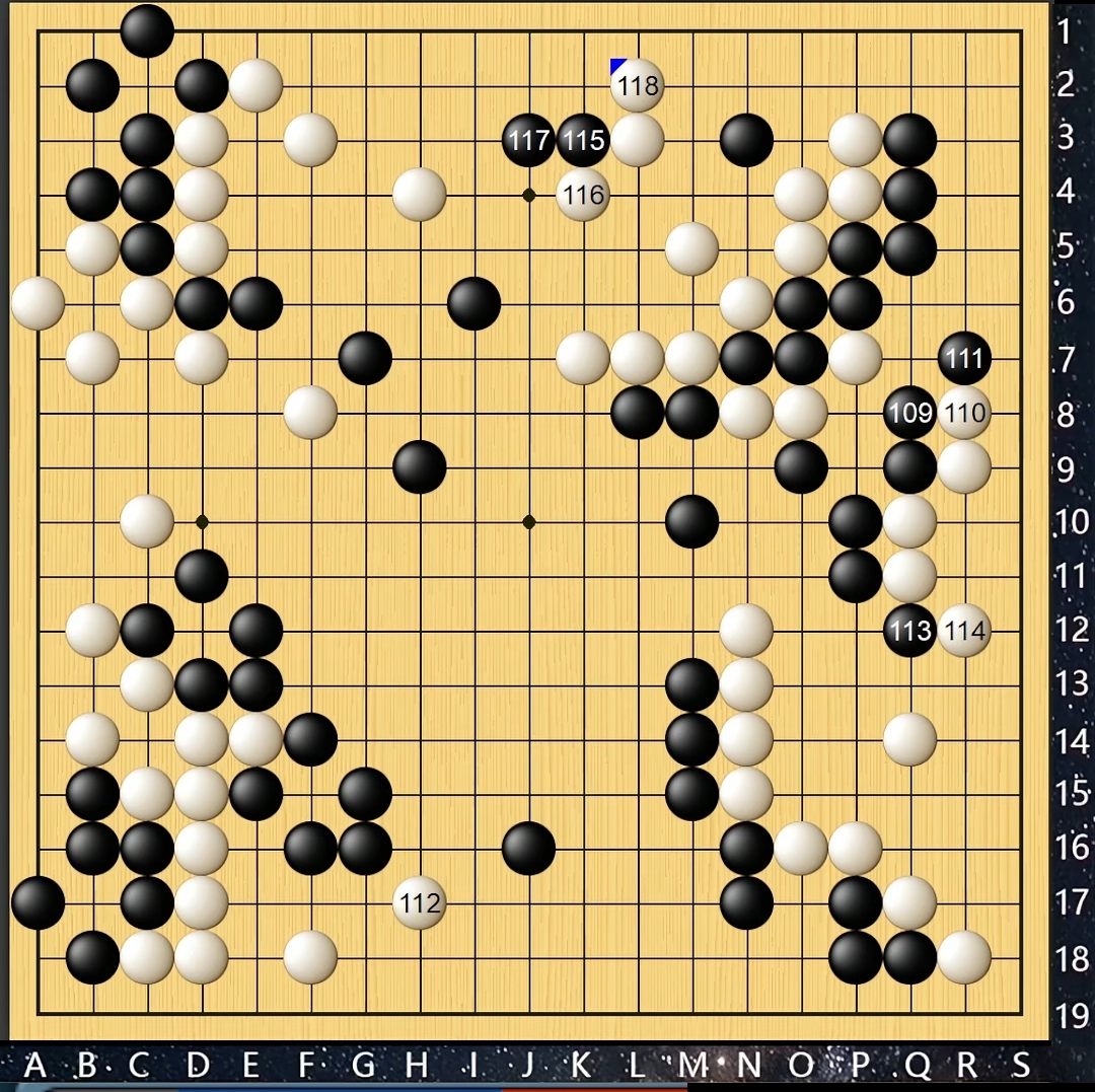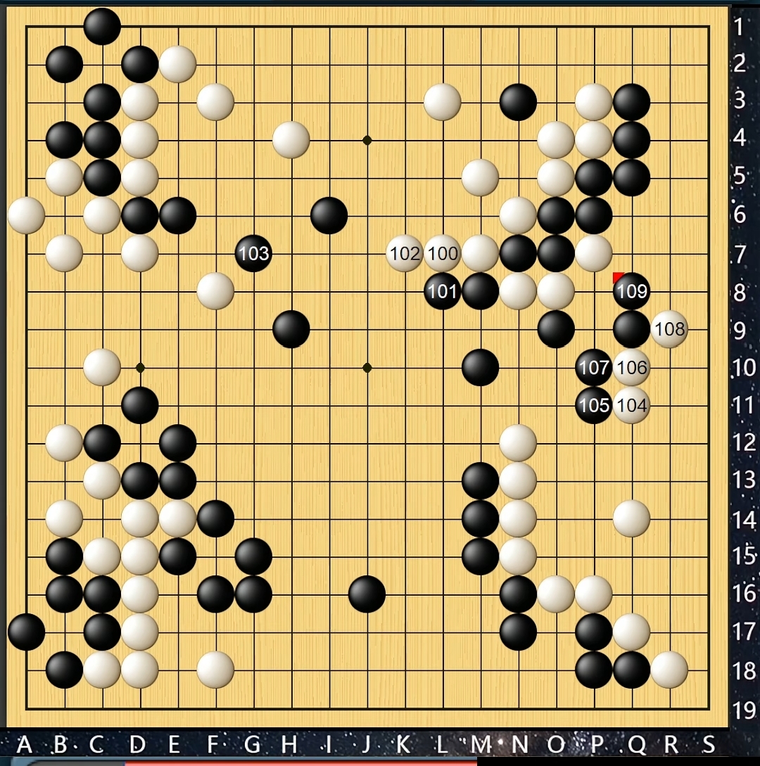 黑103飞给了白棋绝地反击的机会,如何在攻击中获利是摆在江维杰九段面前的一道难题。白104不敢硬刚,转身于右边拆二守空,在优势意识支配下黑棋步步退让,白棋抢到先手于下方小飞悄然间扳回劣势。