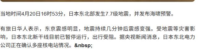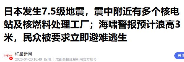 2.2026-04-20《日本发生7.5级地震,震中附近有多个核电站及核燃料处理工厂;海啸警报预计浪高3米,民众被要求立即避难逃生》-红星新闻
