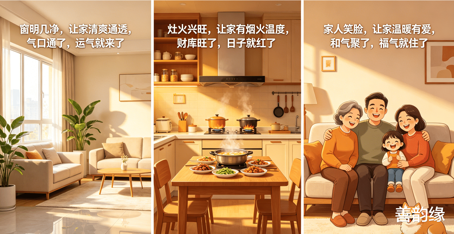 窗明几净,让家清爽通透,气口通了,运气就来了;灶火兴旺,让家有烟火温度,财库旺了,日子就红了;家人笑脸,让家温暖有爱,和气聚了,福气就住了。