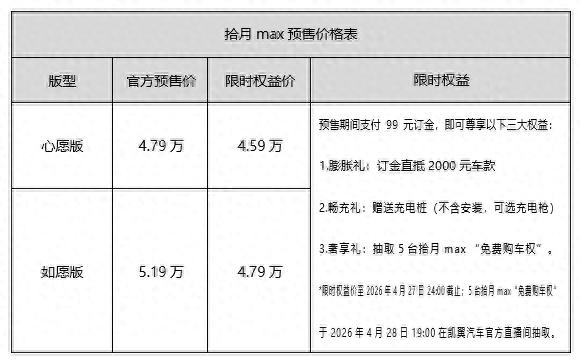 4月15日,凯翼拾月MAX正式开启预售,心愿版官方预售价4.79万元、限时权益价4.59万元;如愿版官方预售价5.19万元、限时权益价4.99万元。预售期支付99元订金,可抵2000元车款,赠送充电桩,还会抽5台“免费购车权”。从数字上看,这已经足够刺激;但真正让我多看一眼的,不只是价格,而是它明显不想再沿用那套“低价=低配=低质感”的老剧本了。