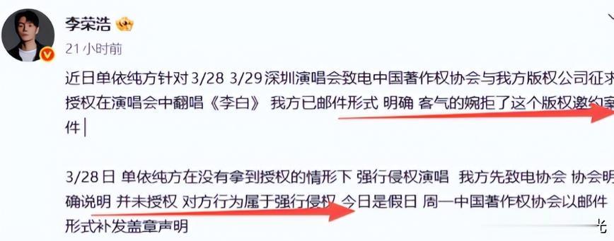 可没人知道,这首歌的翻唱授权,李荣浩方早就明确拒绝过,单依纯属于明知故犯,强行侵权。