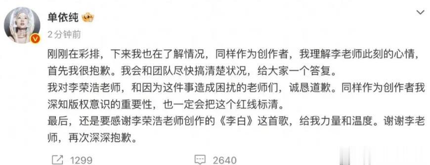 当天下午,单依纯就发微博道歉,说自己正在了解情况,态度看起来十分诚恳。