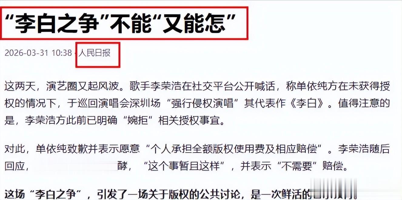 人民日报的点评,相当于给这场纠纷定了调,也让李荣浩心中的那口恶气,终于有了一个最有分量的出口。