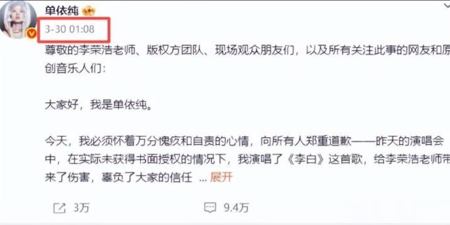 直到3月30日凌晨,单依纯才发布了第二份道歉声明,这一次终于松口,承认自己没有亲自核查授权文件。