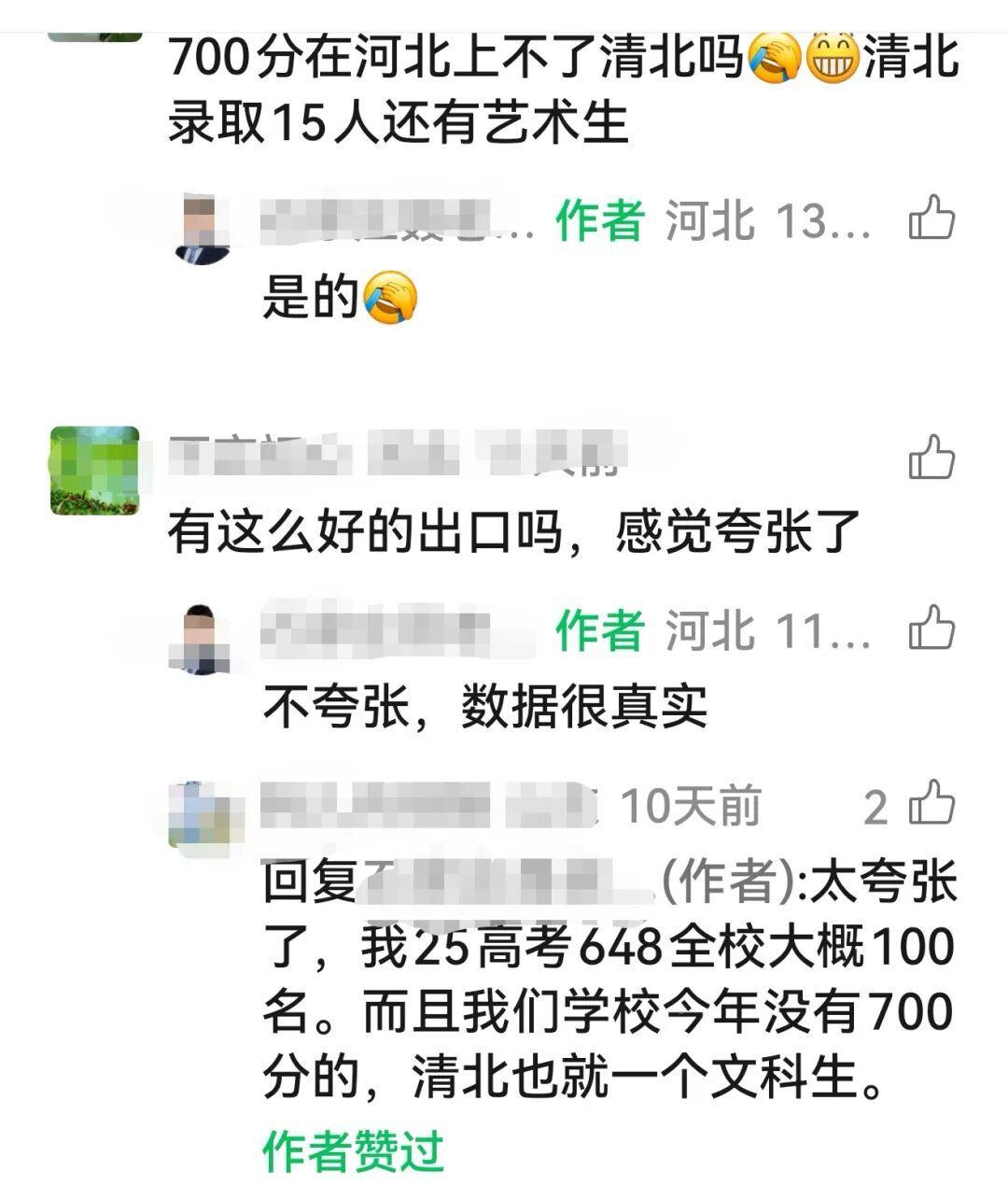 而且据我所知,自2021年“3+1+2”新高考实行以来,石家庄700分以上考生也只有7人,把这些年石家庄700分以上考生都加起来,也不够20人。再来说,这里清北数据的自相矛盾。去年清北在河北物理组最低投档线是688 分,若真有20多位 700分以上的考生,为何仅15人达到录取分数线?甚至还要凑上艺术生 “充数”?