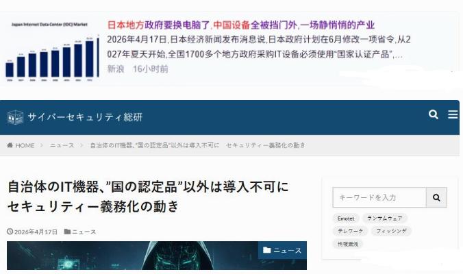 4月17日,《日本经济新闻》刊发一篇报道,标题为《地方自治体IT设备排除中国产品,仅限使用政府认定品》。