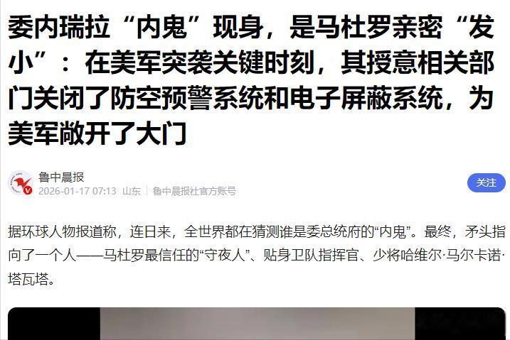 信息来源:委内瑞拉“内鬼”现身,是马杜罗亲密“发小”:在美军突袭关键时刻,其授意相关部门关闭了防空预警系统和电子屏蔽系统,为美军敞开了大门