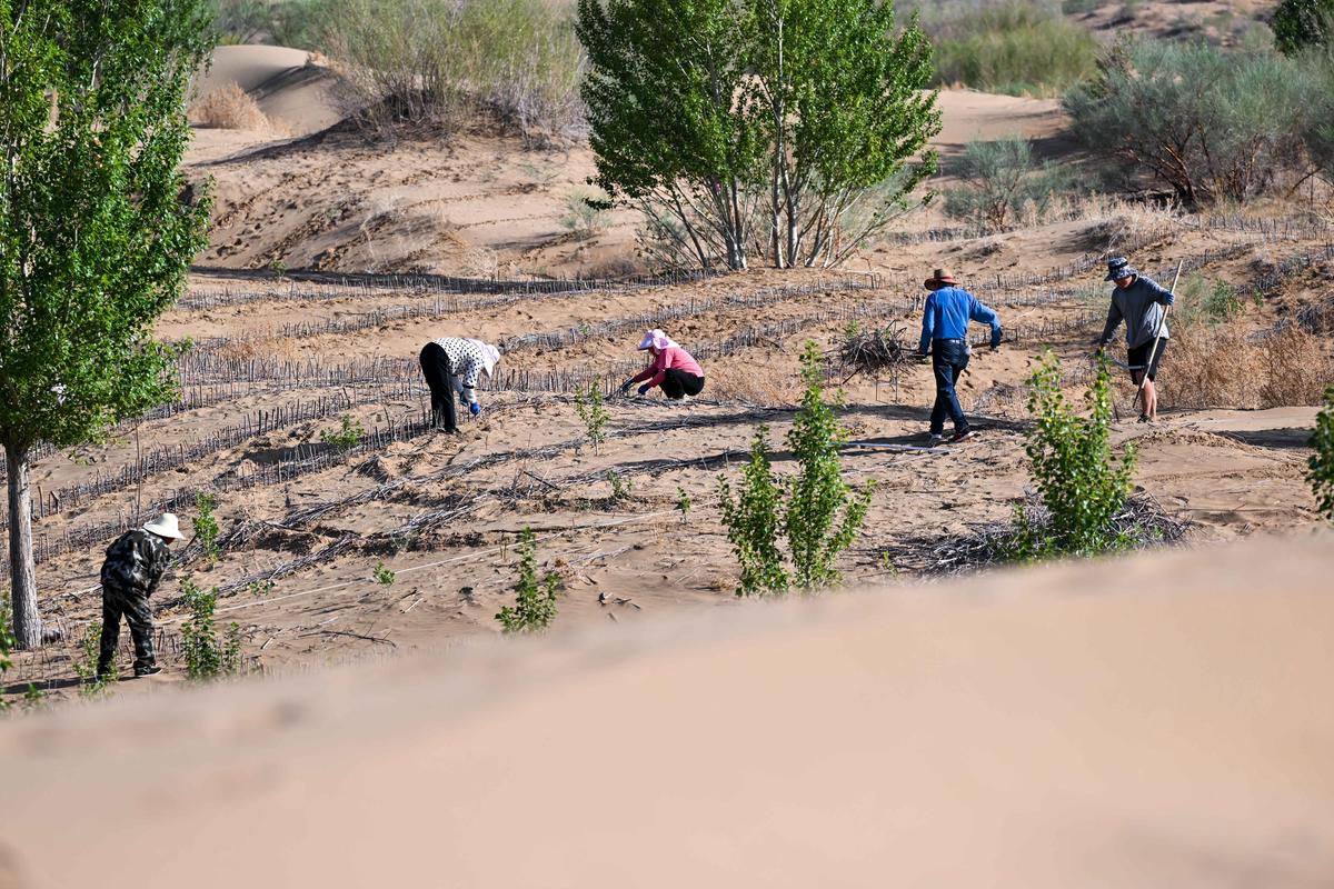 第一步是草方格固沙,用当地随处可见的麦草,扎成1米见方的格子,埋进沙里,就能牢牢锁住流动的黄沙,而且麦草腐烂后,还能当肥料滋养土壤,一举两得。