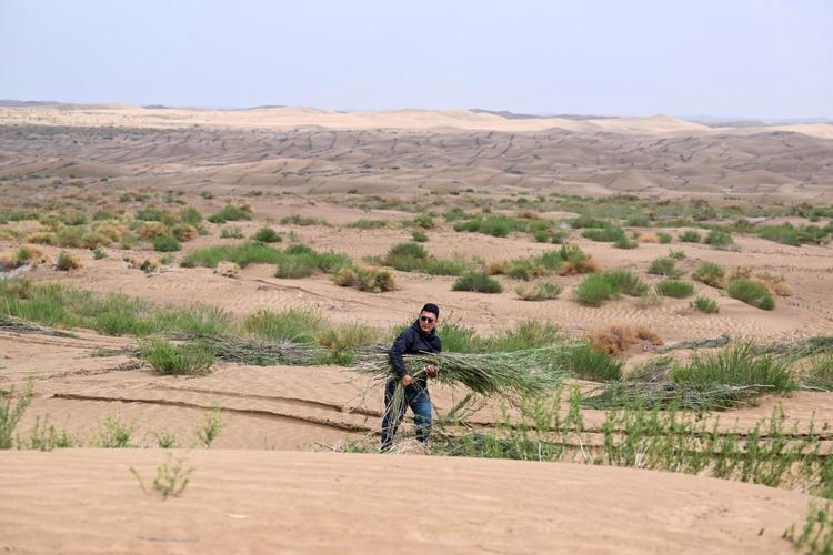 第二步就是种耐旱的植物,沙柳、柠条、沙蒿这些草木,耐旱又耐贫瘠,在沙漠里也能扎根生长,被大面积种下后,一点点给沙漠披绿。