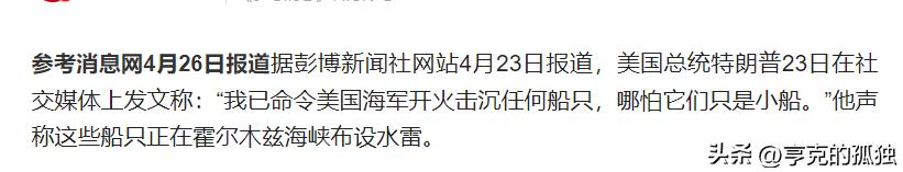 4月23日,特朗普在社交媒体上发文称:“我已命令美国海军开火击沉任何船只,哪怕它们只是小船。”他声称这些船只正在霍尔木兹海峡布设水雷。