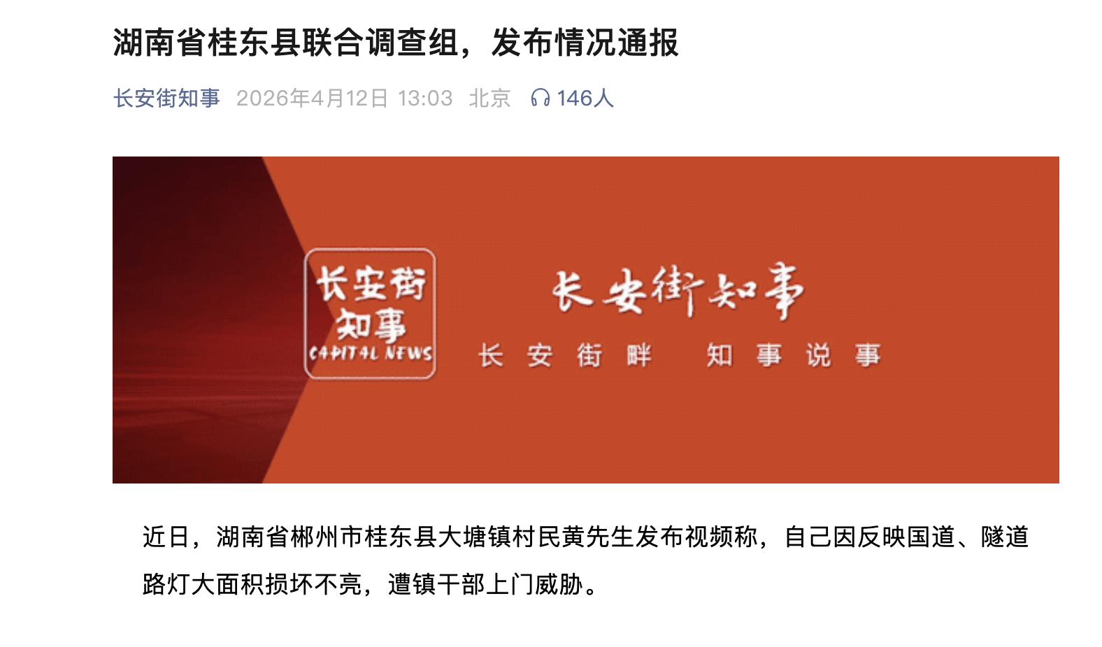 近日,湖南省郴州市桂东县大塘镇村民黄先生发布视频称,自己因反映国道、隧道路灯大面积损坏不亮,遭镇干部上门威胁。