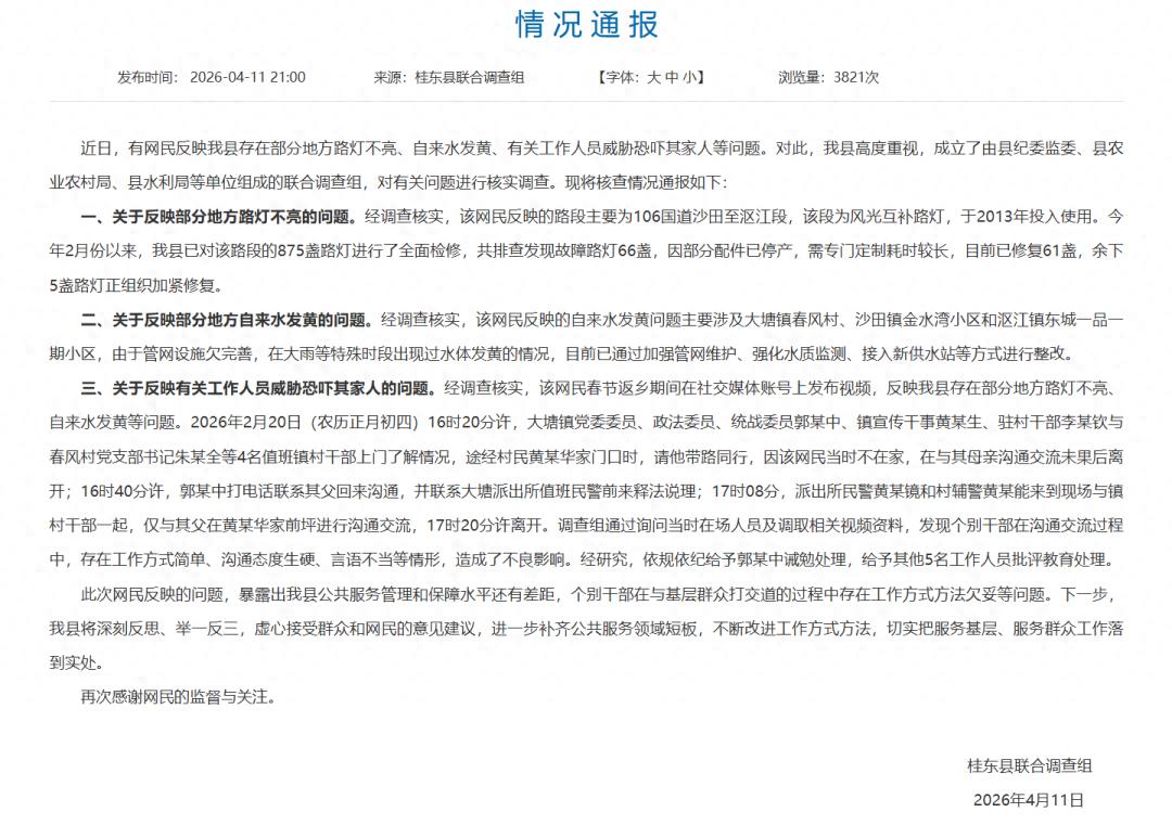 三、关于反映有关工作人员威胁恐吓其家人的问题。经调查核实,该网民春节返乡期间在社交媒体账号上发布视频,反映我县存在部分地方路灯不亮、自来水发黄等问题。2026年2月20日(农历正月初四)16时20分许,大塘镇党委委员、政法委员、统战委员郭某中、镇宣传干事黄某生、驻村干部李某钦与春风村党支部书记朱某全等4名值班镇村干部上门了解情况,途经村民黄某华家门口时,请他带路同行,因该网民当时不在家,在与其母亲沟通交流未果后离开;16时40分许,郭某中打电话联系其父回来沟通,并联系大塘派出所值班民警前来释法说理;17时08分,派出所民警黄某镜和村辅警黄某能来到现场与镇村干部一起,仅与其父在黄某华家前坪进行沟通交流,17时20分许离开。调查组通过询问当时在场人员及调取相关视频资料,发现个别干部在沟通交流过程中,存在工作方式简单、沟通态度生硬、言语不当等情形,造成了不良影响。经研究,依规依纪给予郭某中诫勉处理,给予其他5名工作人员批评教育处理。