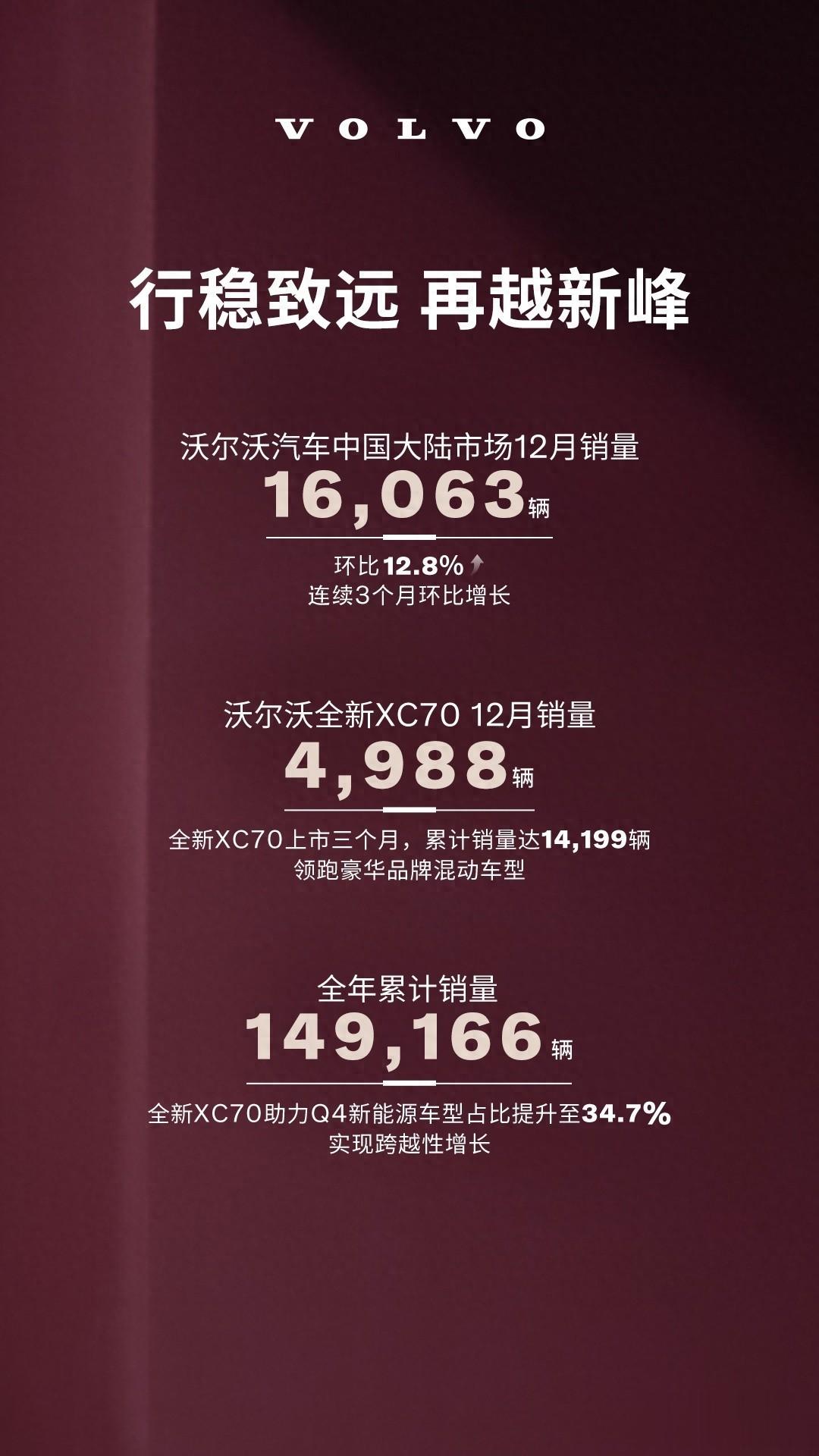 近日,沃尔沃汽车公布了2025年12月的销售数据,中国大陆市场单月销量达到16,063辆,环比增长12.8%,全年累计销量突破149,166辆。这一成绩在竞争激烈的豪华车市场中显得尤为稳健,同时再次凸显了沃尔沃品牌在中国市场的持续吸引力和优异表现。