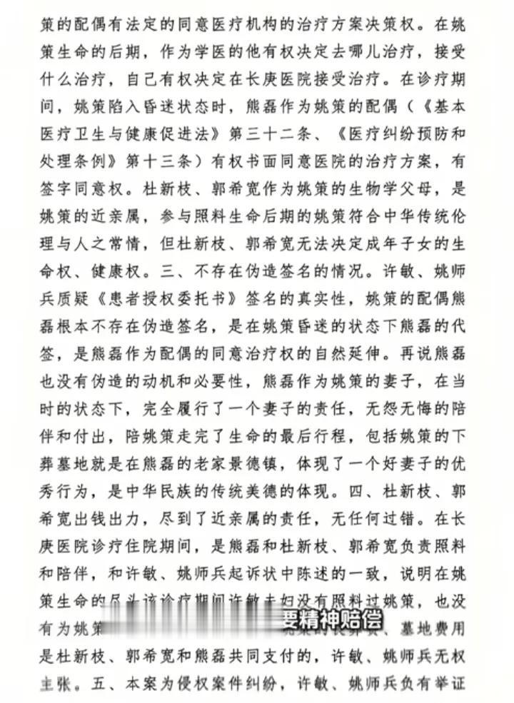 杜新枝则表示,家属只是拒绝了姚策临终前的有创治疗(如开喉、电击等),但是日常治疗并未中断。