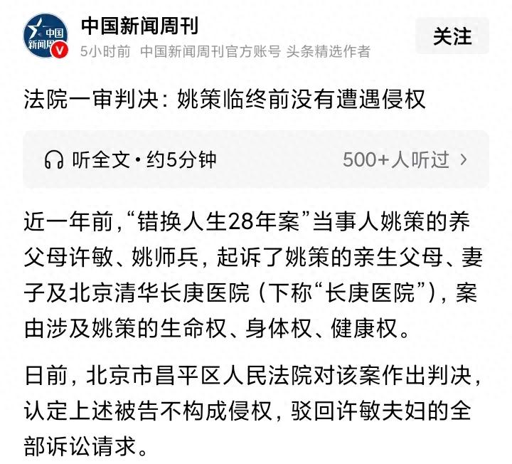 “三拒绝”一审判决,姚策临终前没有遭遇侵权,北京昌平法院对该案作出判决,驳回许敏夫妇的部诉讼请求。