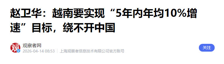 赵卫华:越南要实现“5年内年均10%增速”目标,绕不开中国 观察者网 2026-04-14 08:53 上海观察者信息技术有限公司官方账号