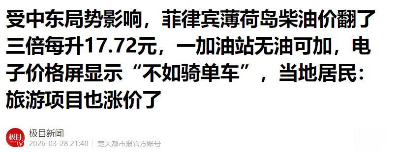 极目新闻:受中东局势影响,菲律宾薄荷岛柴油价翻了三倍每升17.72元,一加油站无油可加,电子价格屏显示“不如骑单车”,当地居民:旅游项目也涨价了 2026-03-28