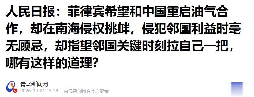 青岛新闻网:人民日报:菲律宾希望和中国重启油气合作,却在南海侵权挑衅,侵犯邻国利益时毫无顾忌,却指望邻国关键时刻拉自己一把,哪有这样的道理? 2026-04-21
