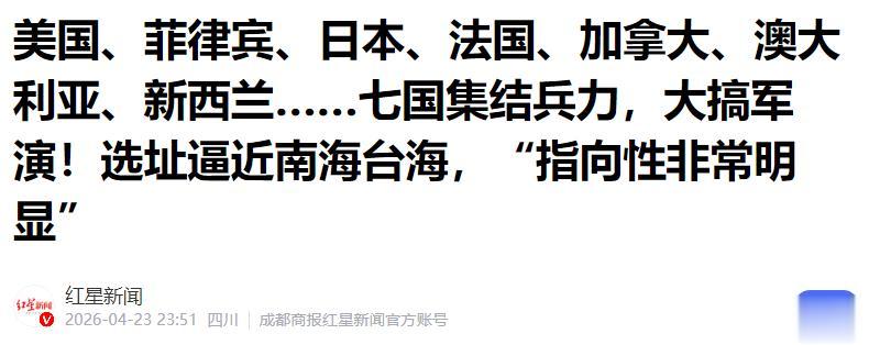红星新闻:美国、菲律宾、日本、法国、加拿大、澳大利亚、新西兰……七国集结兵力,大搞军演!选址逼近南海台海,“指向性非常明显” 2026-04-23