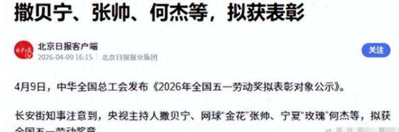 四月伊始,娱乐圈与主持圈双双迎来重磅喜讯!中华全国总工会正式公示2026年全国五一劳动奖拟表彰名单,央视名嘴撒贝宁赫然在列,消息一经发布便被各大央媒争相转发,这份国家级荣誉的分量,不言而喻。